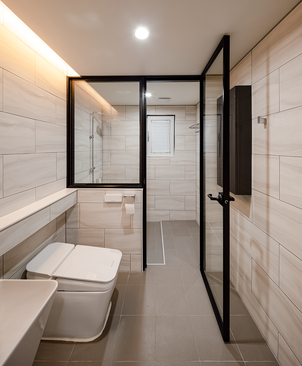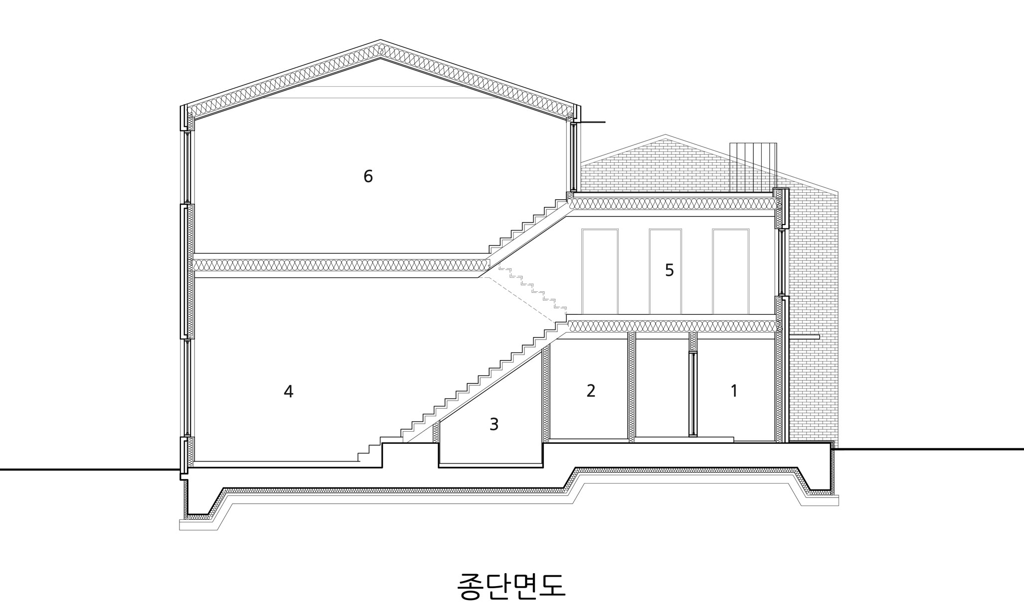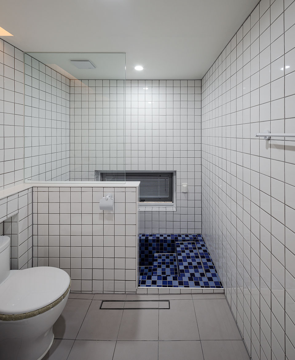 주어진 공사비와 주어진 면적 안에서 사용자의 요구 사항을 모두 만족시키는 일은 정말 어려운 문제이다. 모든 실들을 크게 두기가 어렵기 때문에 자칫 손실될 수도 있는 공간을 찾아 활용하는 방법을 찾는 게 건축사의 설계안이라고 생각한다. 1층의 메인 계단의 하부의 낮은 부분은 외부 창고로 활용하고, 천정고를 이용하여 대변기와 세면대를 계획하였다.
