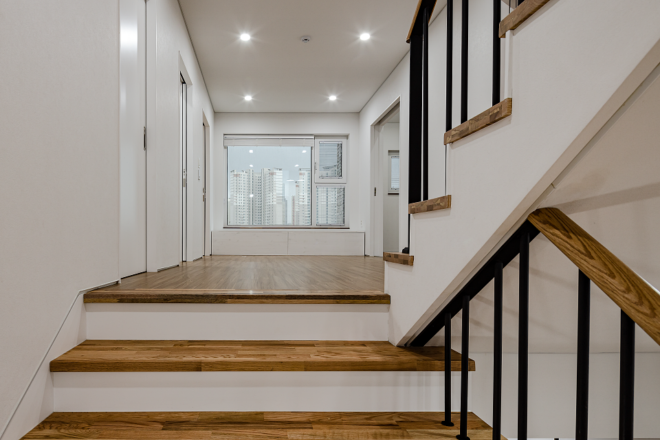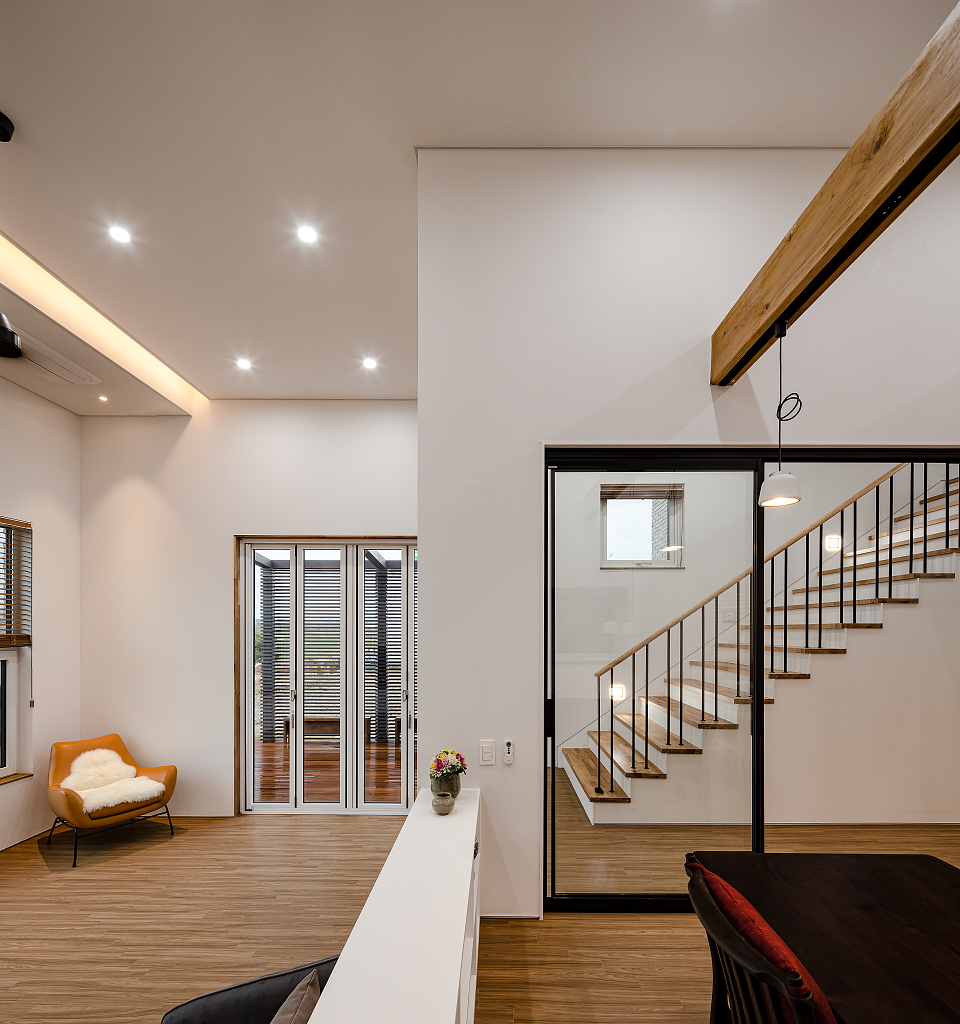 건축주분의 부모님이 오시는 경우를 고려해서 넓게 요청한 계단은 이 집의 메인 오브제로, 집의 중심에 위치하여 수평적으로는 기능에 따른 구분을, 수직으로는 각 실의 성격에 따른 구분을 하도록 계획되었다.