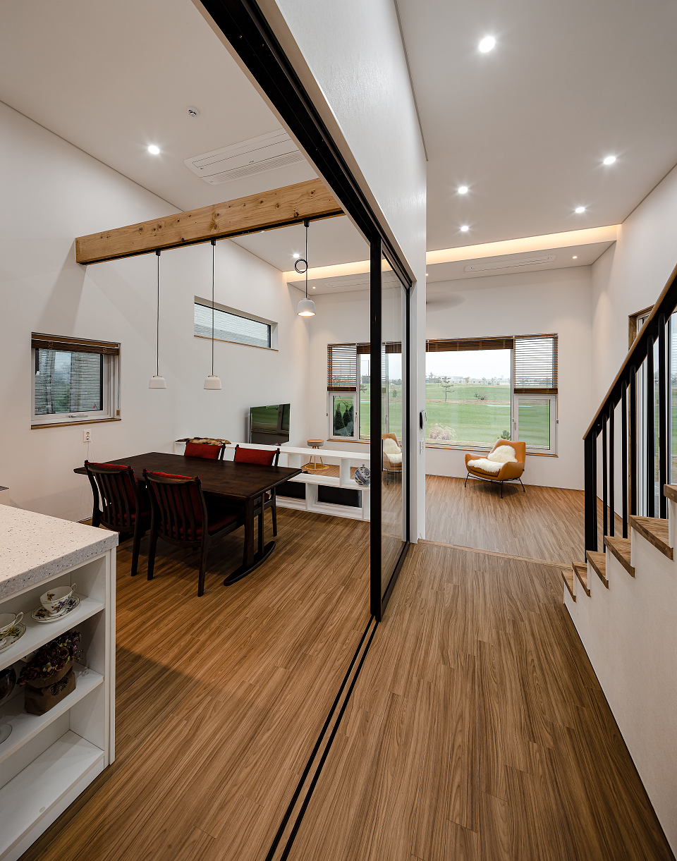 사생활은 보호하면서 단독주택의 삶을 누리길 원한 건축주를 위해 사적 공간은 분리하고 가족만을 위한 공간인 툇마루 및 안마당과 취미실이 있는 집을 지었다. 대지 내 경사를 활용한 스킵플로어 형태와 더불어 높은 층고의 거실과 채광을 위한 전면의 큰 창은 집의 공간감을 극대화해준다.