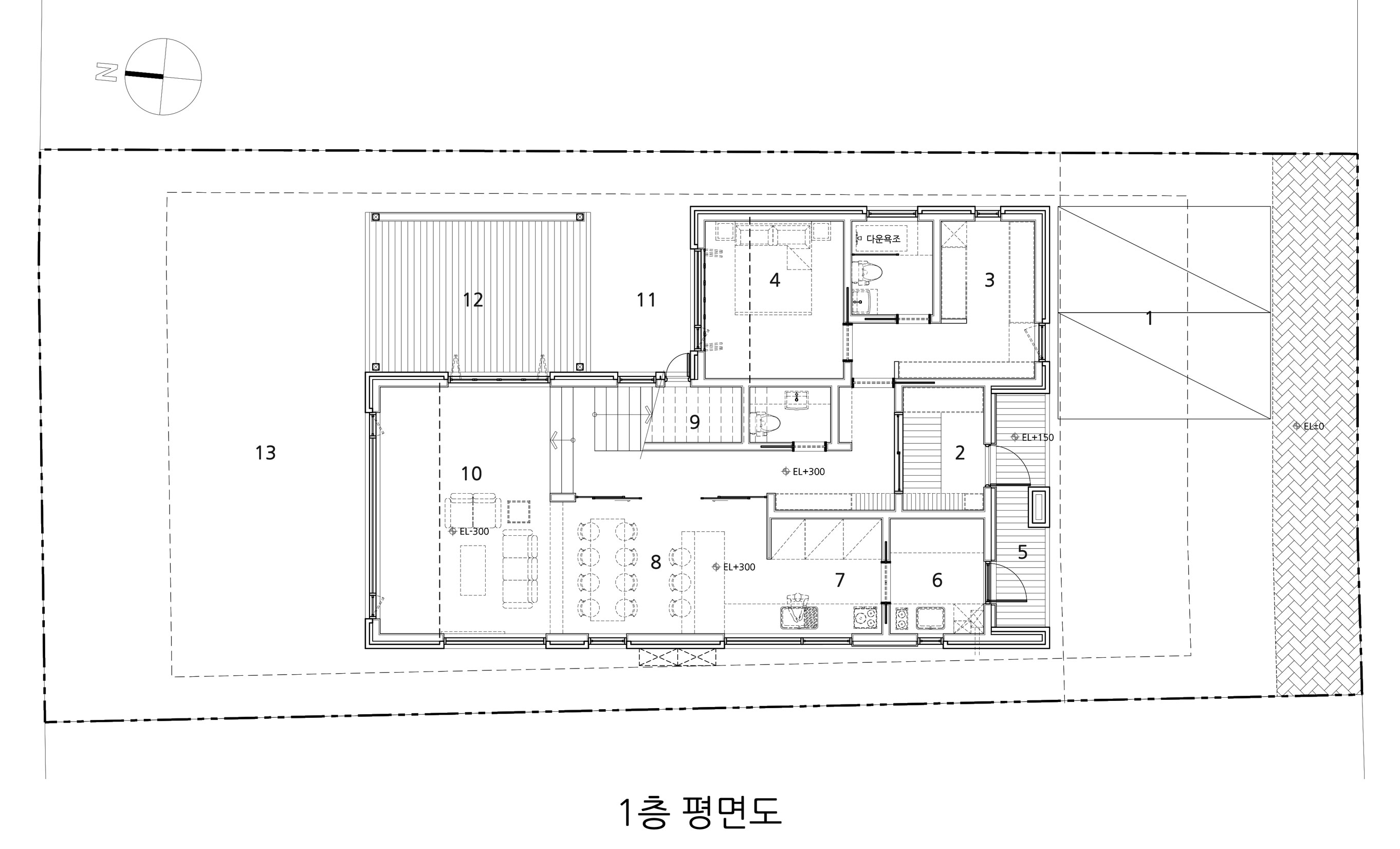 1층의 안방은 조망이 좋은 북쪽에 배치를 하고 서비스 공간(화장실 및 드레스룸)을 남쪽에 배치하여 도로로부터의 프라이버시를 확보하였다.