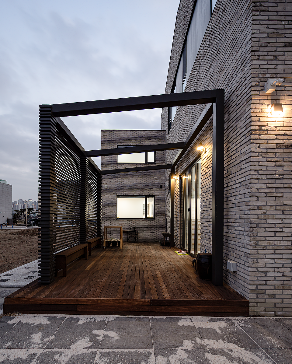 또한 건축물의 출입구인 현관은 대지의 중심에 배치하여 진입 시 두 개의 매스로 분절된 건축물이 주는 위화감을 감소시켰으며, 차량에서 식재료나 생활용품을 나를 때 비를 맞지 않고 진입할 수 있도록 현관문 옆에는 별도로 주차장과 다용도실을 연결하는 출입구를 둬 이용자의 편의를 향상시켰다. 사생활 보호를 원한 건축주를 위해 분절된 2개의 매스 중 동측(우측) 매스는 프라이빗 한 실을 분리하여 1층에는 안방, 2층에는 자녀방을 계획하였다.