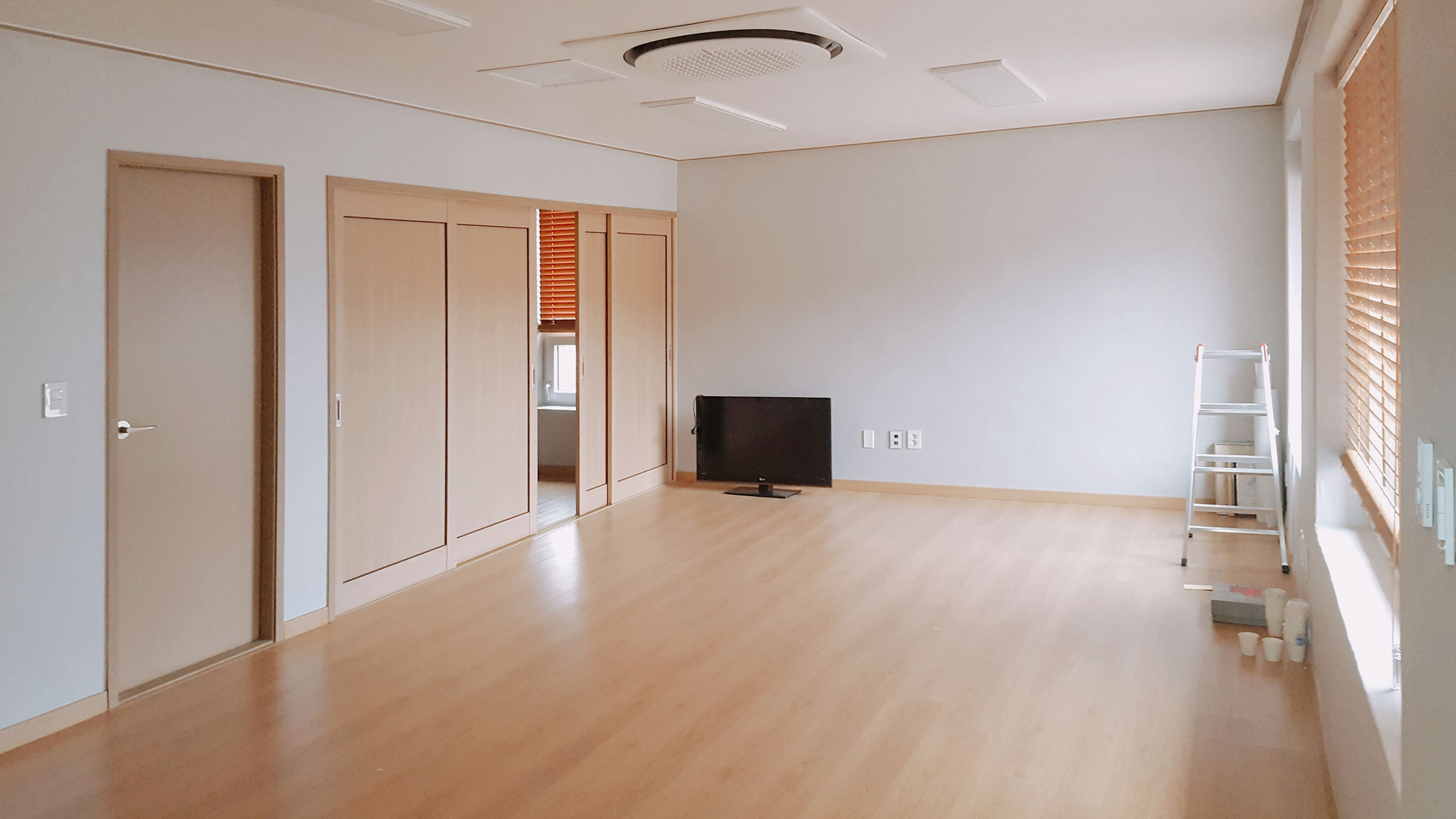 내부 공간은 현관을 지나 2개의 출입구를 분리하여, 남, 여 사용 주민의 프라이버시를 고려했으며 화장실도 구분하여 설치했습니다. 특히 연동도어를 통해 각 실이 분리 및 통합이 가능하도록 디자인하고, 주방 상부 공간에 다락을 설치하여 계절에 따른 짐 등을 보관할 수 있도록 하였습니다.