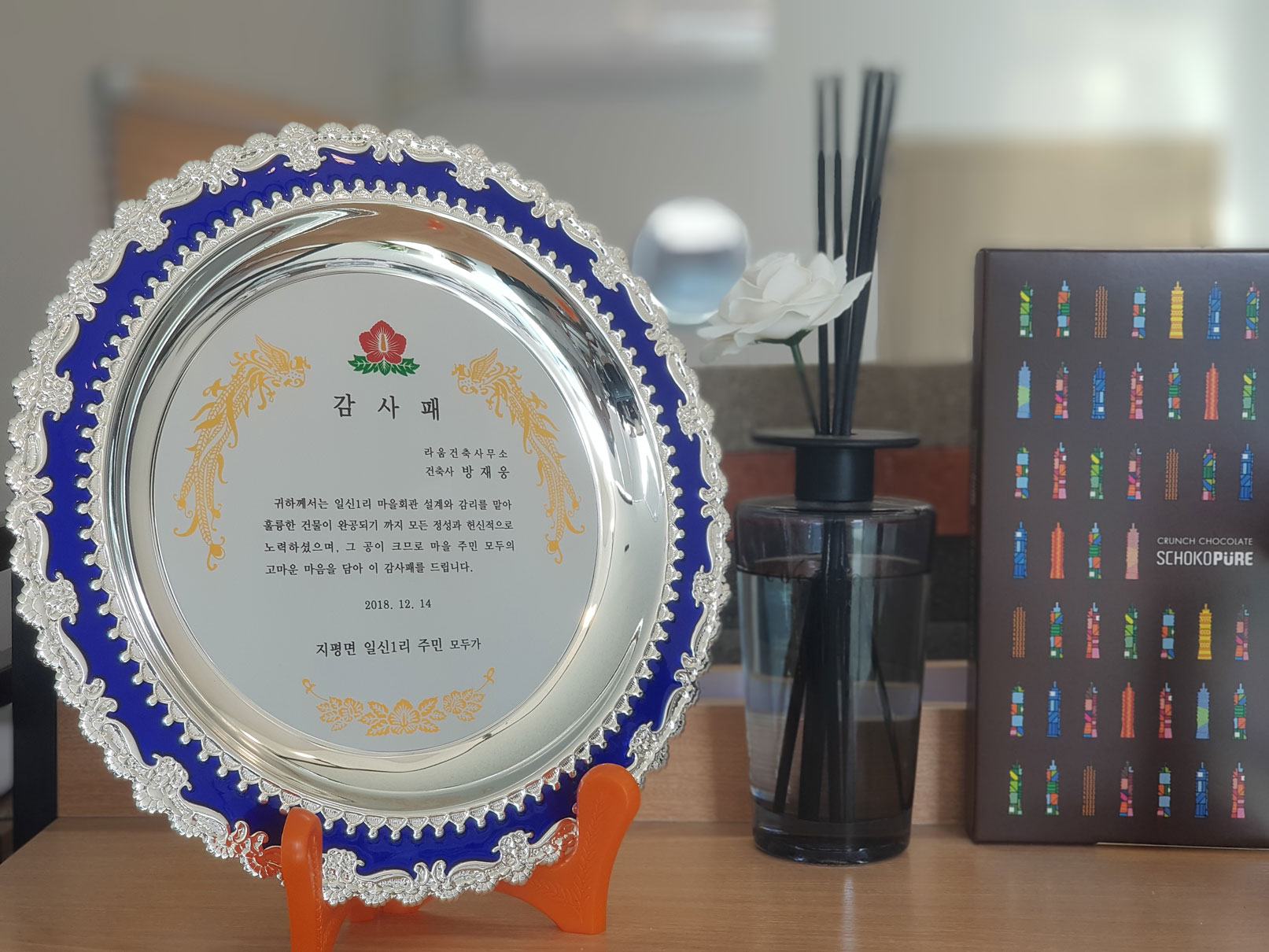설계부터 시공과정을 지켜보면서 힘든 순간도 많았지만 마을 주민들이 이해하고 좋아해 주시는 모습을 보면서 더욱 열심히 작업했던 프로젝트입니다. 준공식 때 생각하지도 못한 감사패를 지평면 일신1리 주민분들께서 주셔서 감사했고 잊지 못할 현장이 될 것 같습니다.