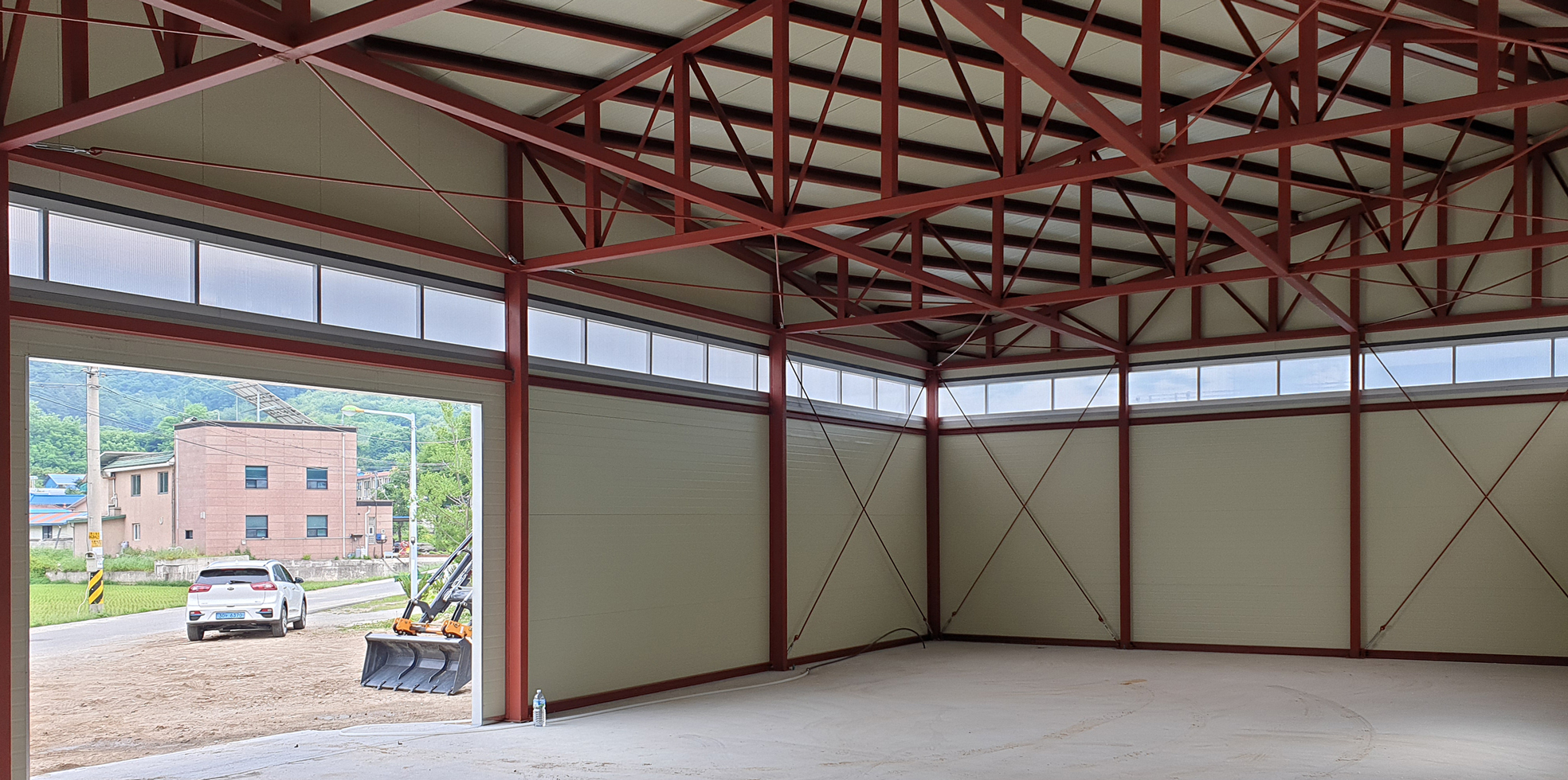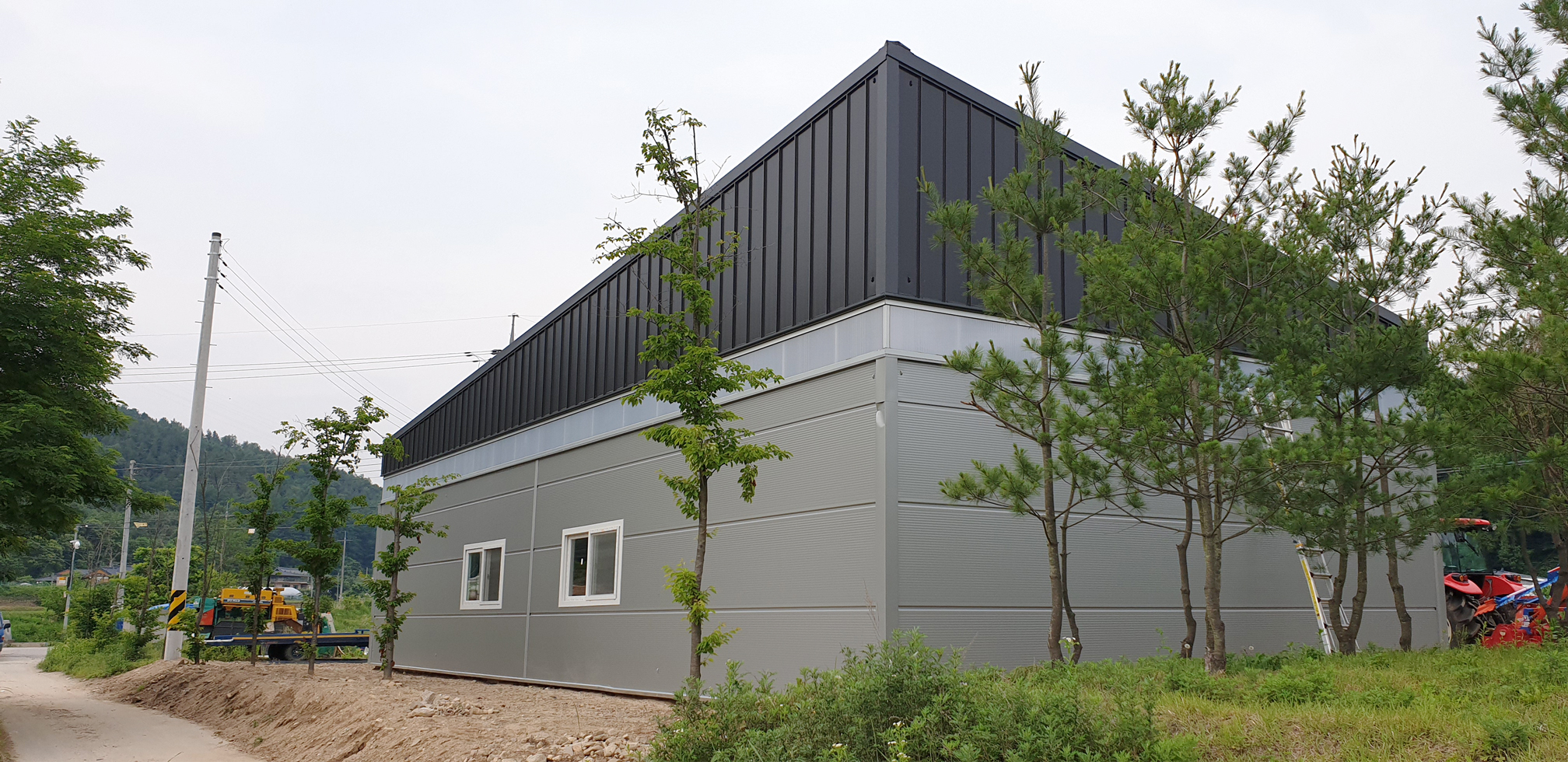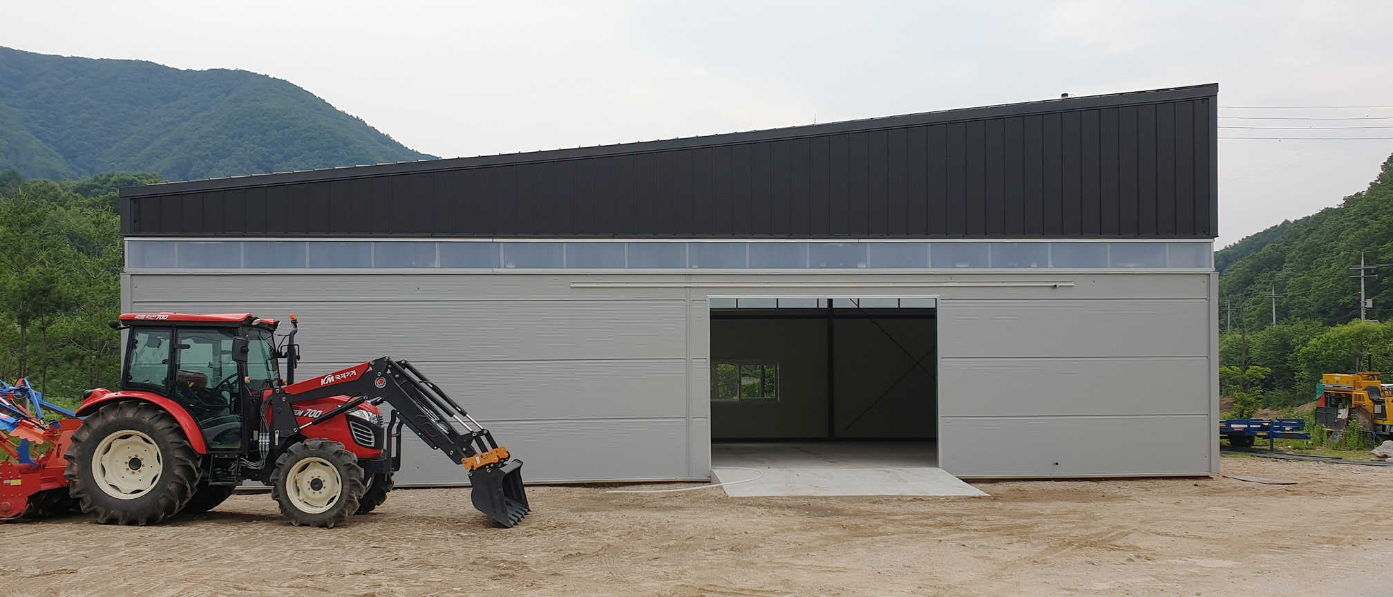 일신리 마을회관 설계를 인연으로 마을 농기계 창고도 진행하게 되었습니다. 비용이 많이 들지 않는 선에서 일반적인 디자인의 샌드위치 패널 창고가 아닌 마을회의도 진행 가능한 창고를 만들었습니다.
