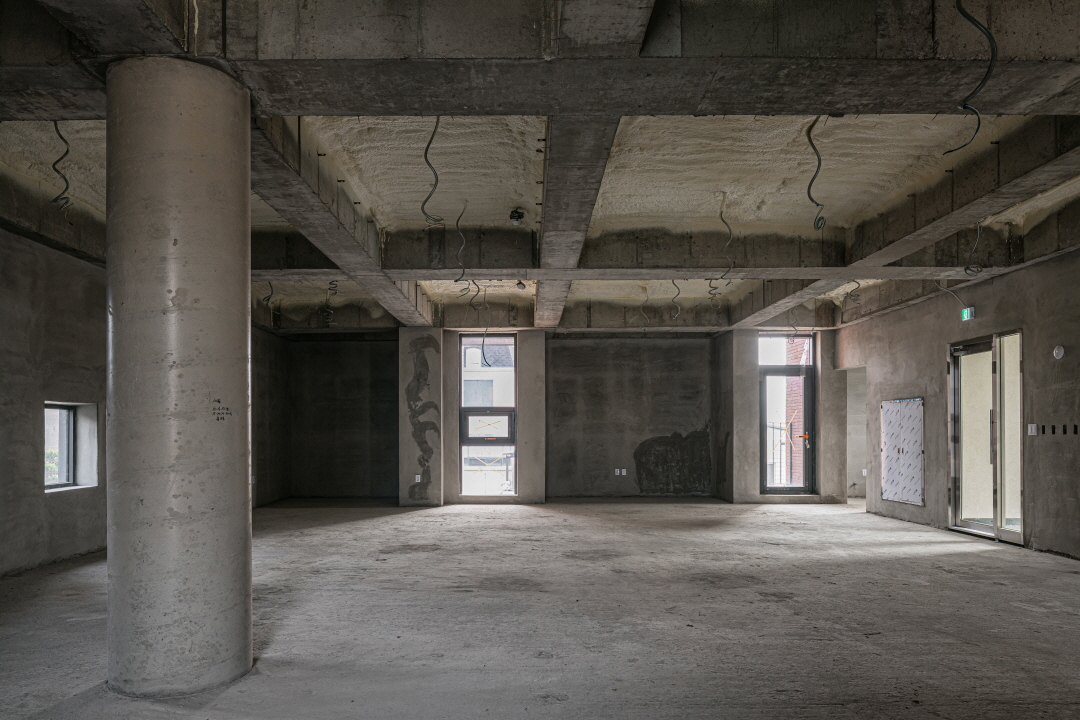 용문역 상업지구 내 위치한 "ㄱ"자 형태의 대지. 건축주는 대지 내 공지를 통해 이루어지고 있던 뒤쪽의 상가 및 주택의 통행을 유지하고 지역 주민과의 상생을 고려한 디자인을 요구했다. 무엇보다 도로에 접한 부분은 좁고 안쪽에 넓은 공간이 존재하는 대지 형태로 인해 건물의 접근성과 인지성을 위해 도로에 가깝게 배치를 할지, 건물의 사용성을 고려하여 후면에 배치할지에 대한 논의가 오갔던 상황.