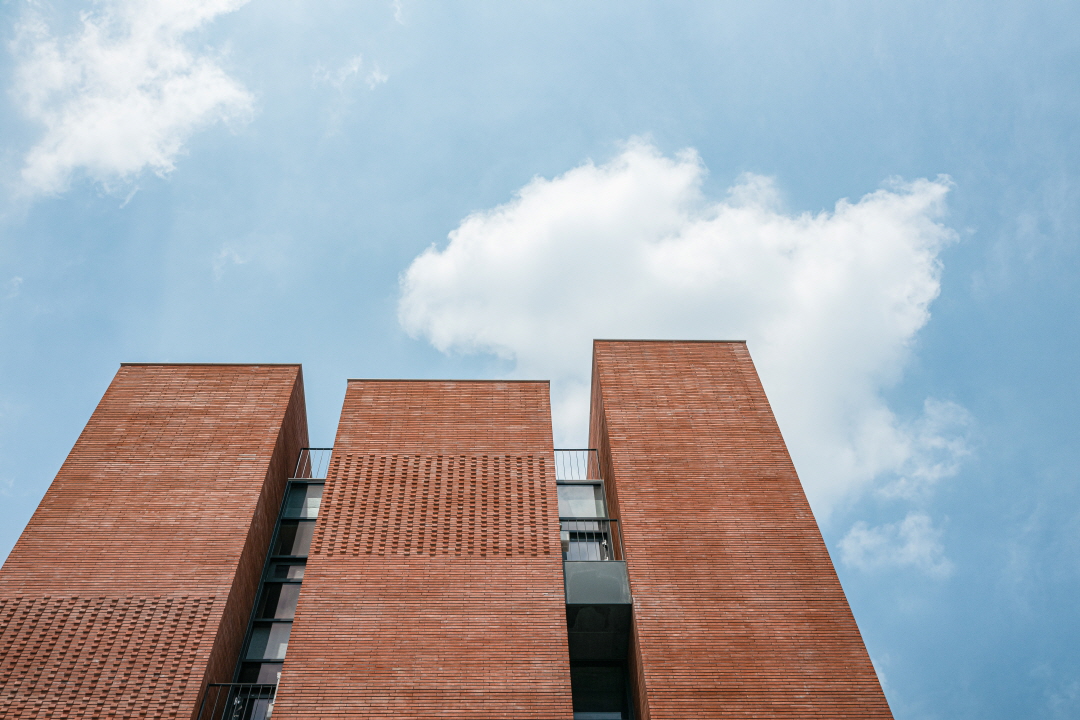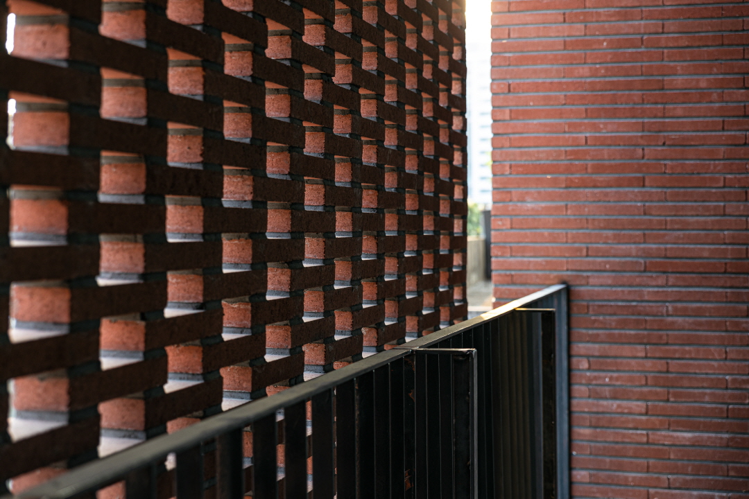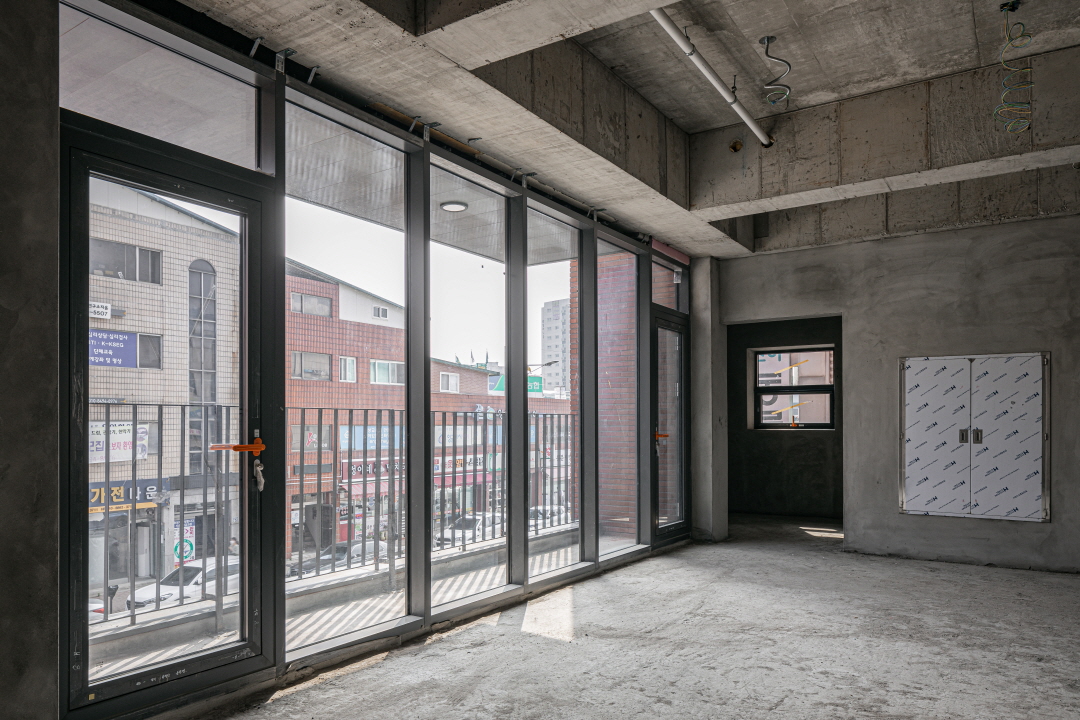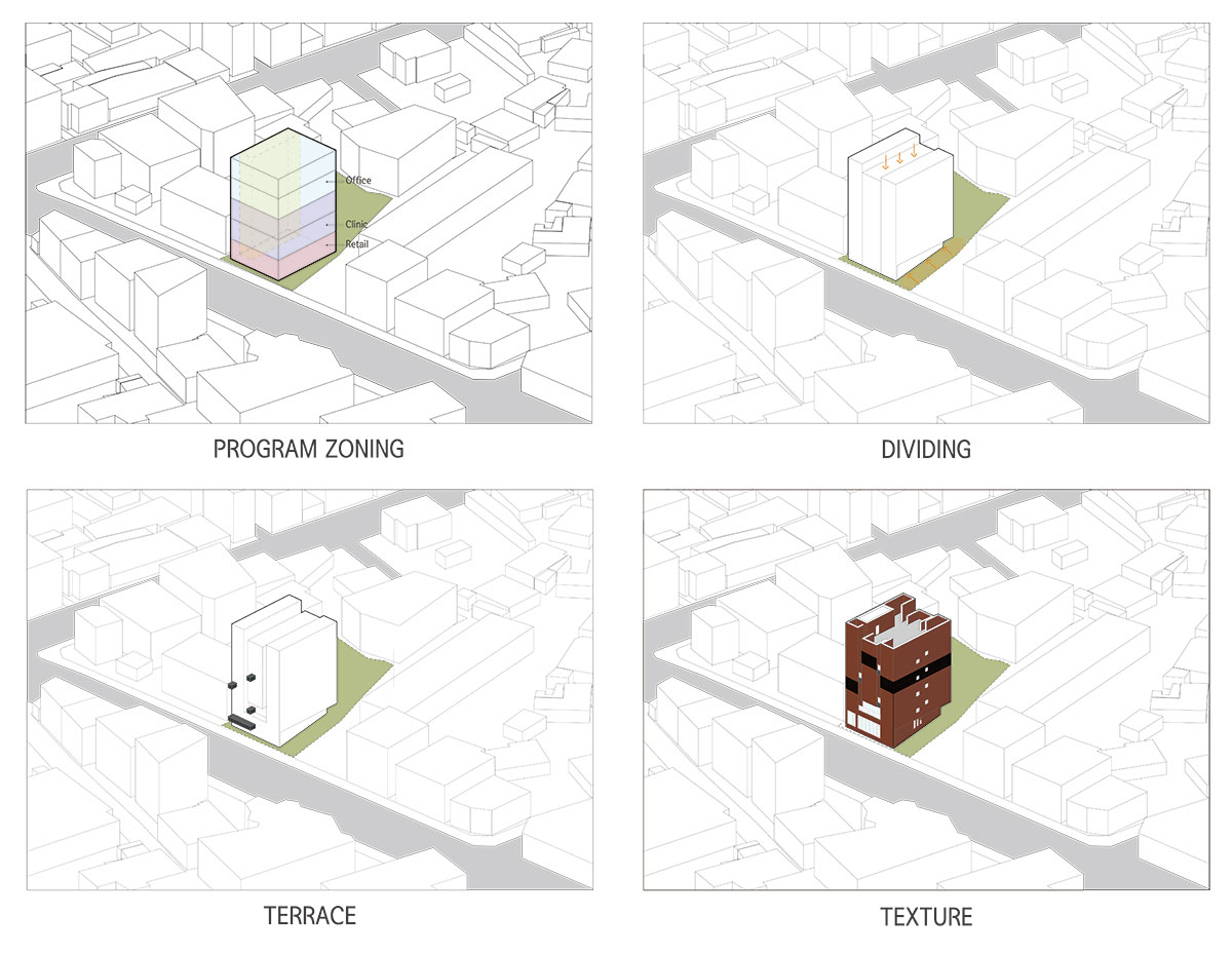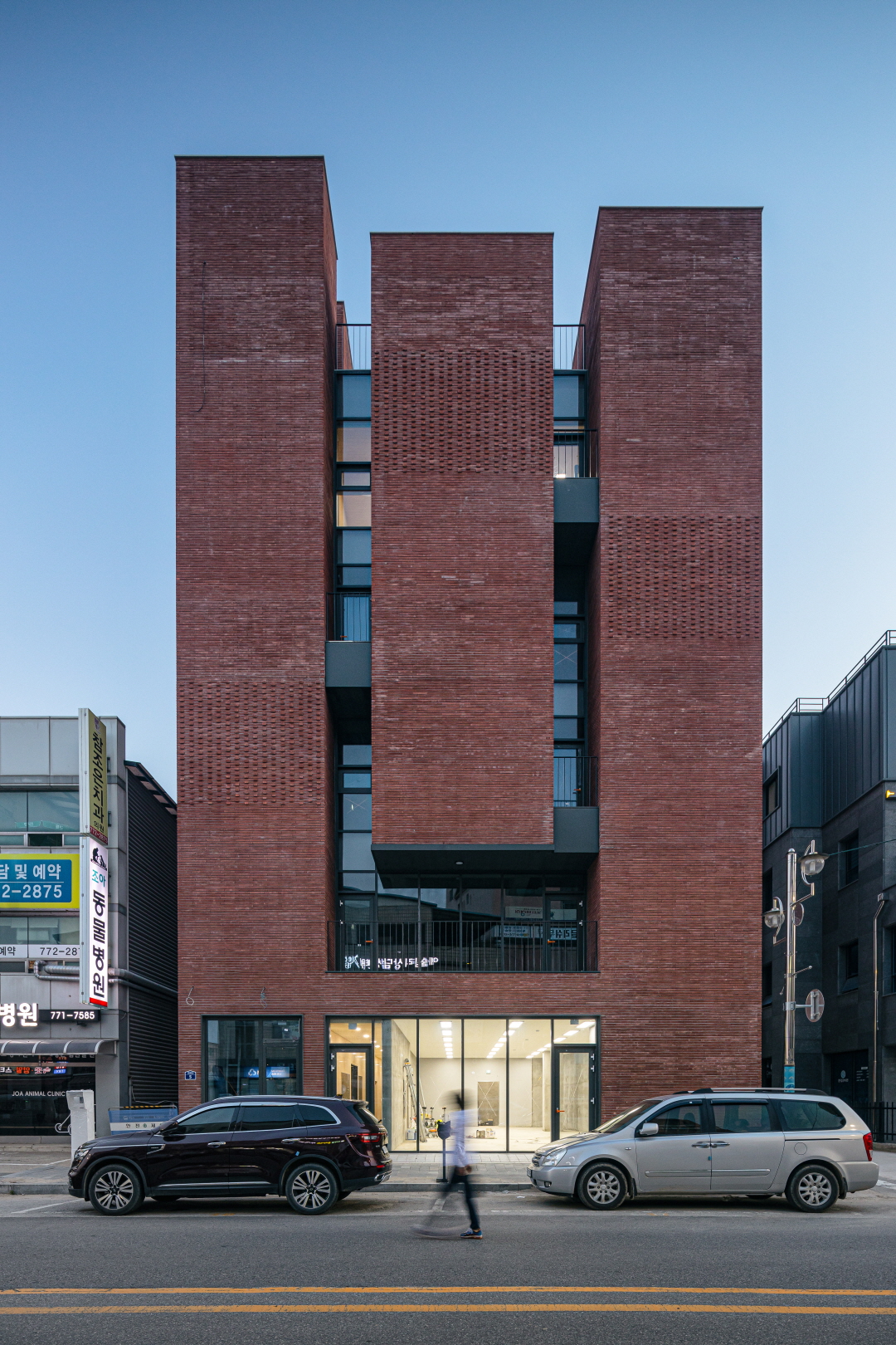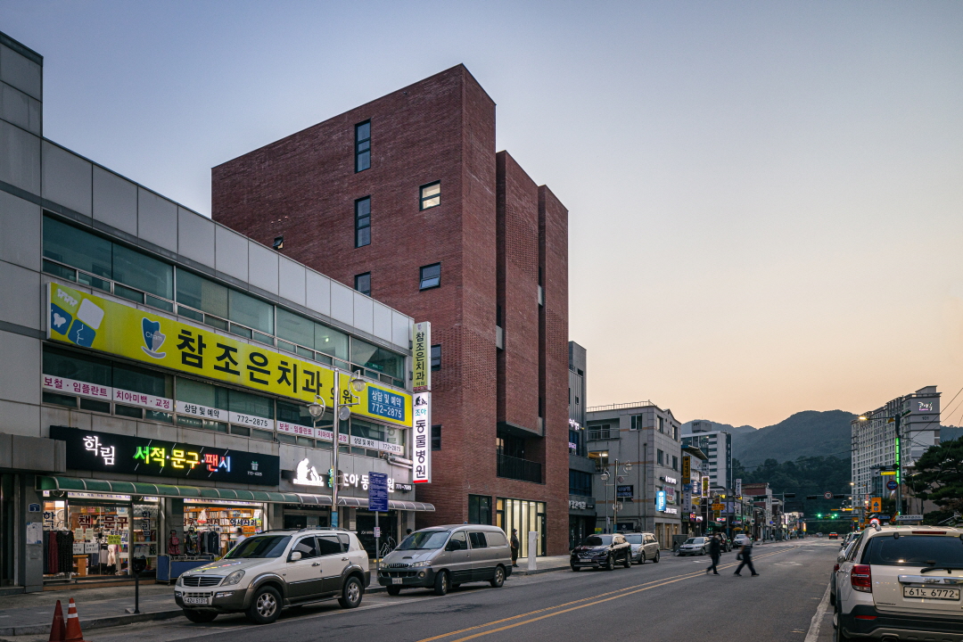 각 층별로 벽돌을 돌려쌓아 일조에 따른 건물의 입체감을 주었으며, 공간쌓기 한 벽돌 벽체 사이로 햇빛과 조명이 다양하게 연출되도록 입면을 디자인하였다. 특히 각 층별 다양한 형태의 테라스는 상가공간에 외부와의 접점을 만들었고, 임대상가에서 부족할 수 있는 개방감은 테라스로 보완하여 단조로울 수 있는 공간에 변화를 줬다.