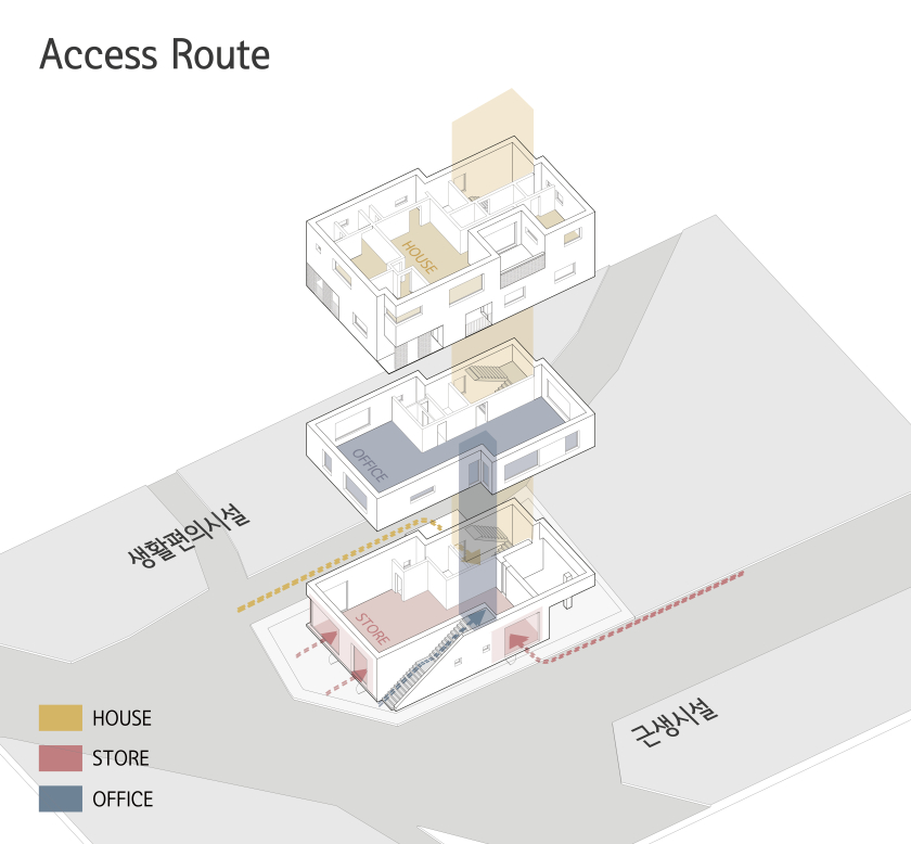 상가주택의 경우 두 종류의 용도가 복합되기 때문에 단일용도에 비해 인지성, 접근성 등 복합적으로 고민이 필요한 부분이 많았다. 주택사용자의 경우 프라이버시를 고려하여 상가사용자와는 독립된 공간을 원하지만, 상가사용자의 경우 상가가 돋보이고 방문객들의 접근이 용이하도록 구성이 필요하여 두 용도의 사용자간의 분리를 위한 요소를 활용하였다.