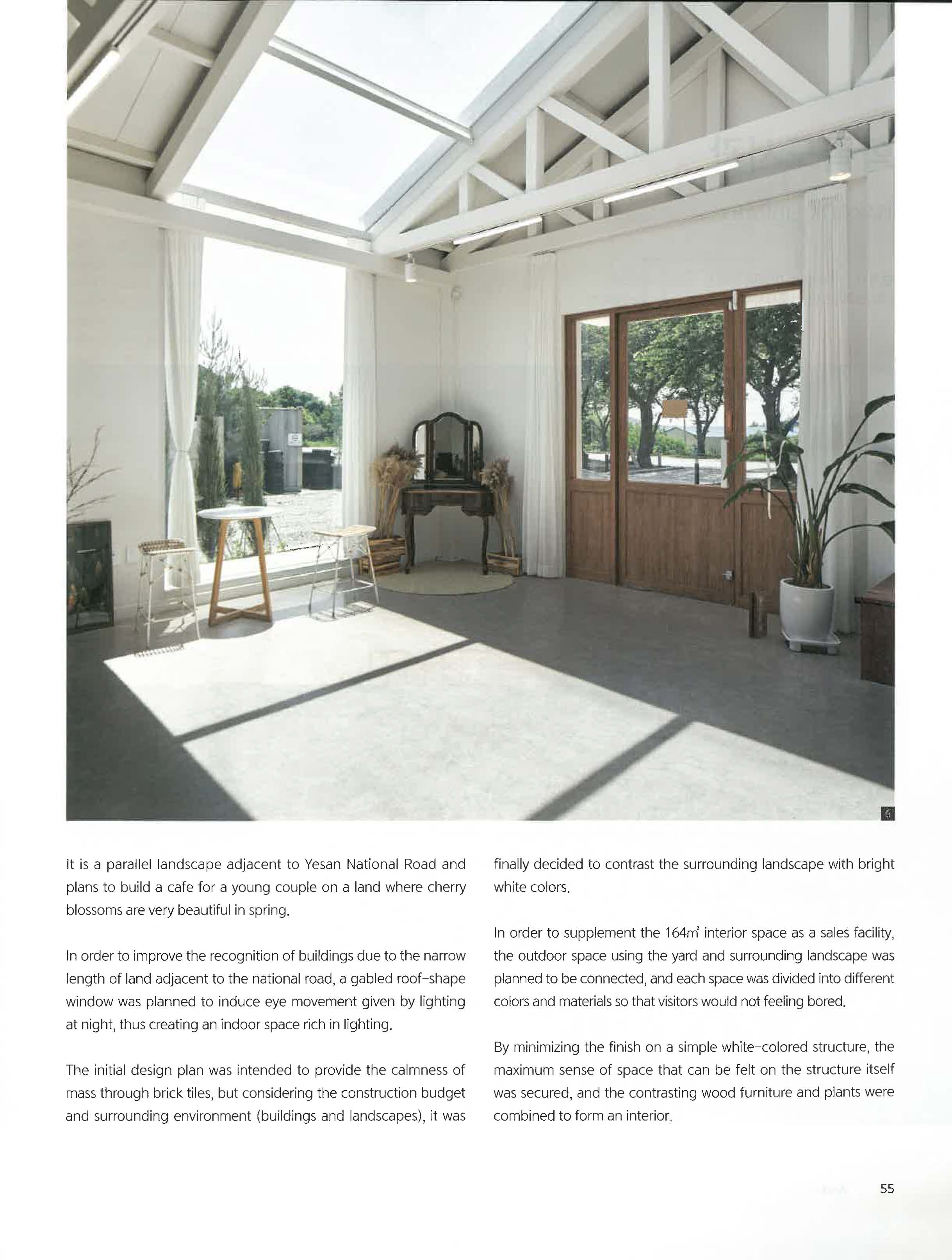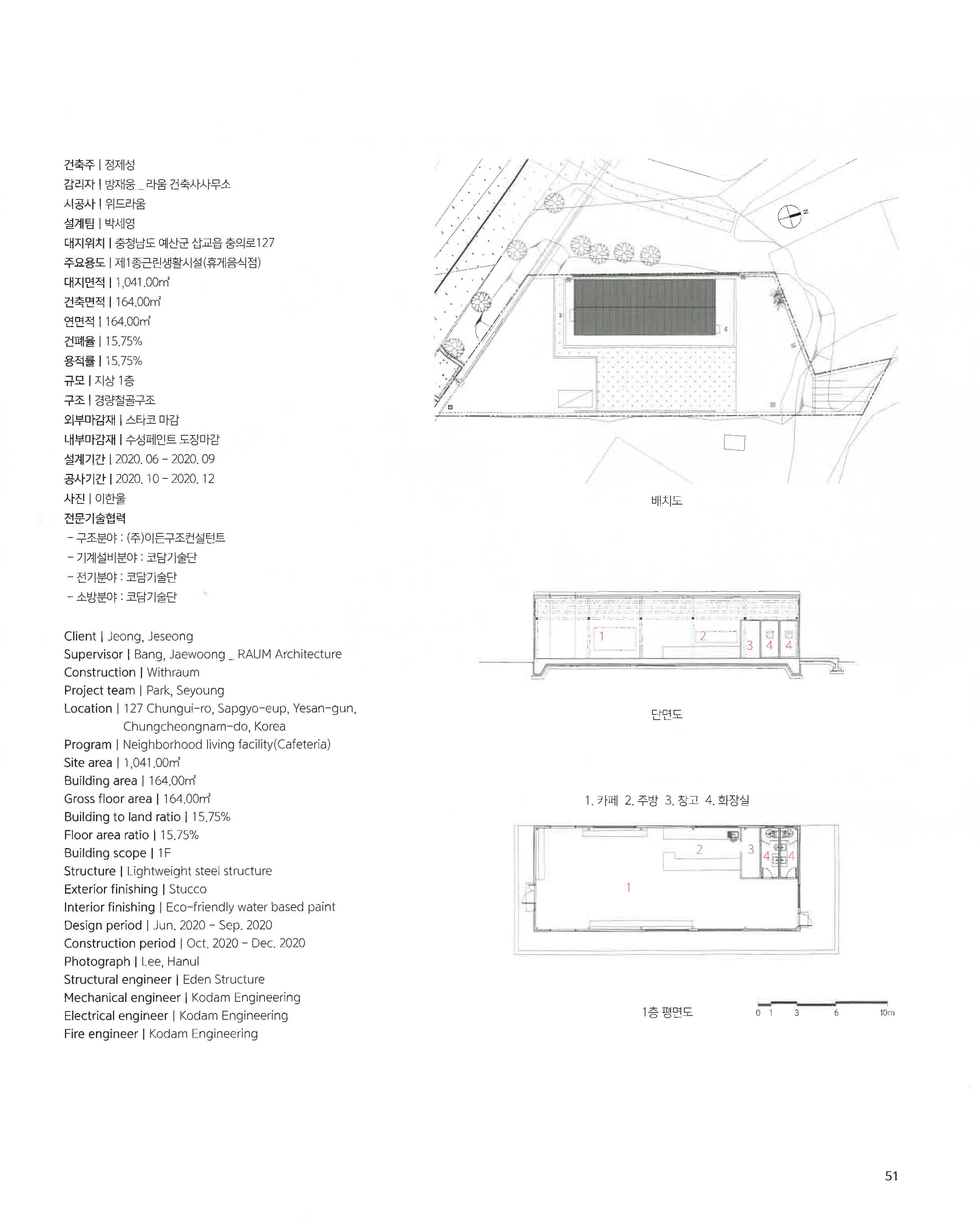 News/2021 [월간 건축사] 예산 카페 제 2막 카페 제 2막 위치: 충남 예산군 삽교읍 상하리 용도: 제2종 근린생활시설(휴게음식점) 규모: 지상1층 대지면적: 1,041㎡ (314.9py) 건축면적: 164㎡ (49.61py) 연면적: 164㎡ (49.61py) 구조: 경량철골조 사진: 나르실리온 이한울 시공: 위드라움 설계: 라움 건축사사무소 방재웅 소장, 박세영 디자이너 ▽ 카페 제 2막 보러가기 공유하기 게시글 관리 라움 건축사사무소