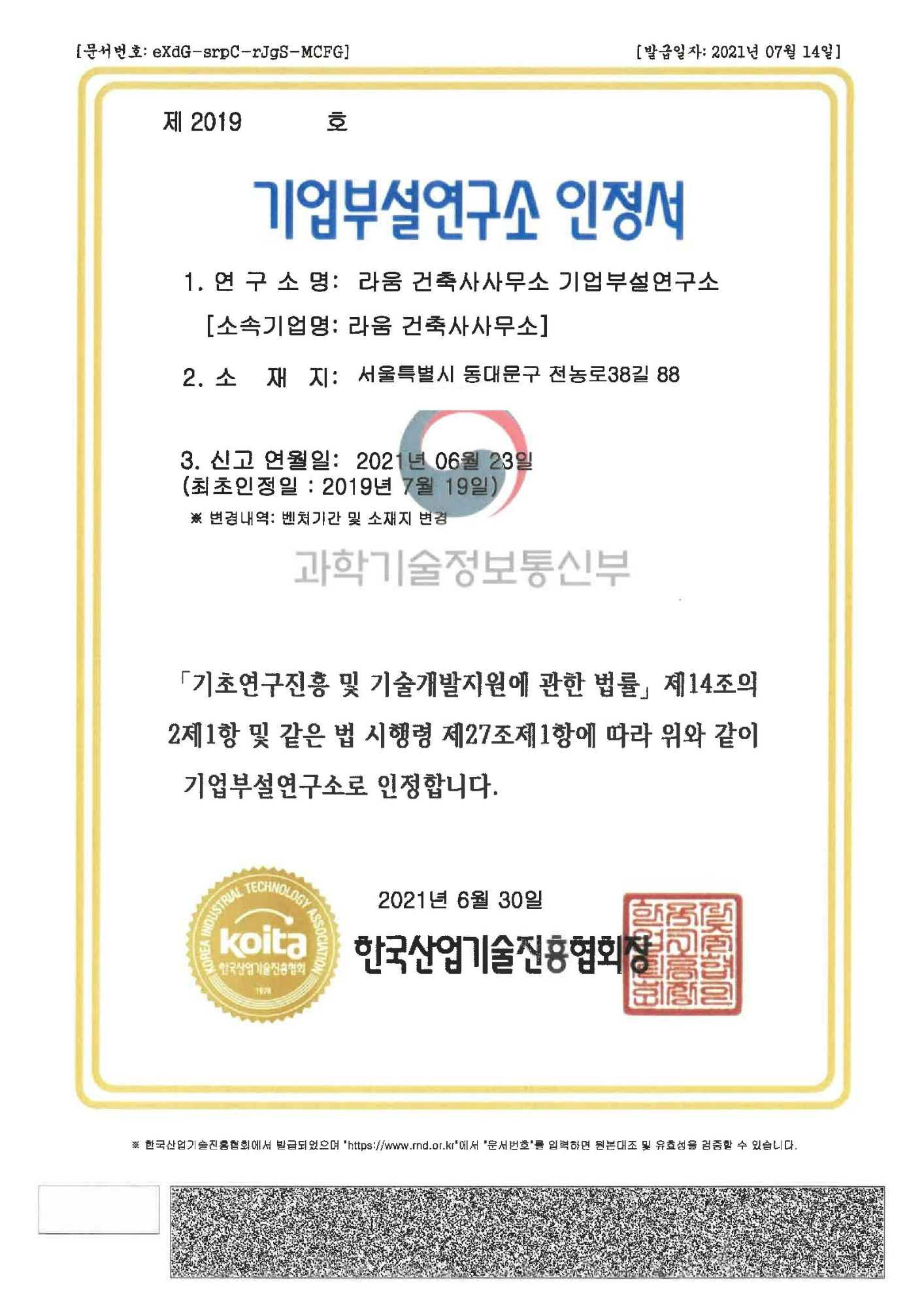 Certificates [기업부설연구소] 라움건축사사무소 기업부설연구소 2019년 7월 19일 라움건축사사무소 기업부설연구소가 개설되었습니다. 공유하기 게시글 관리 라움 건축사사무소