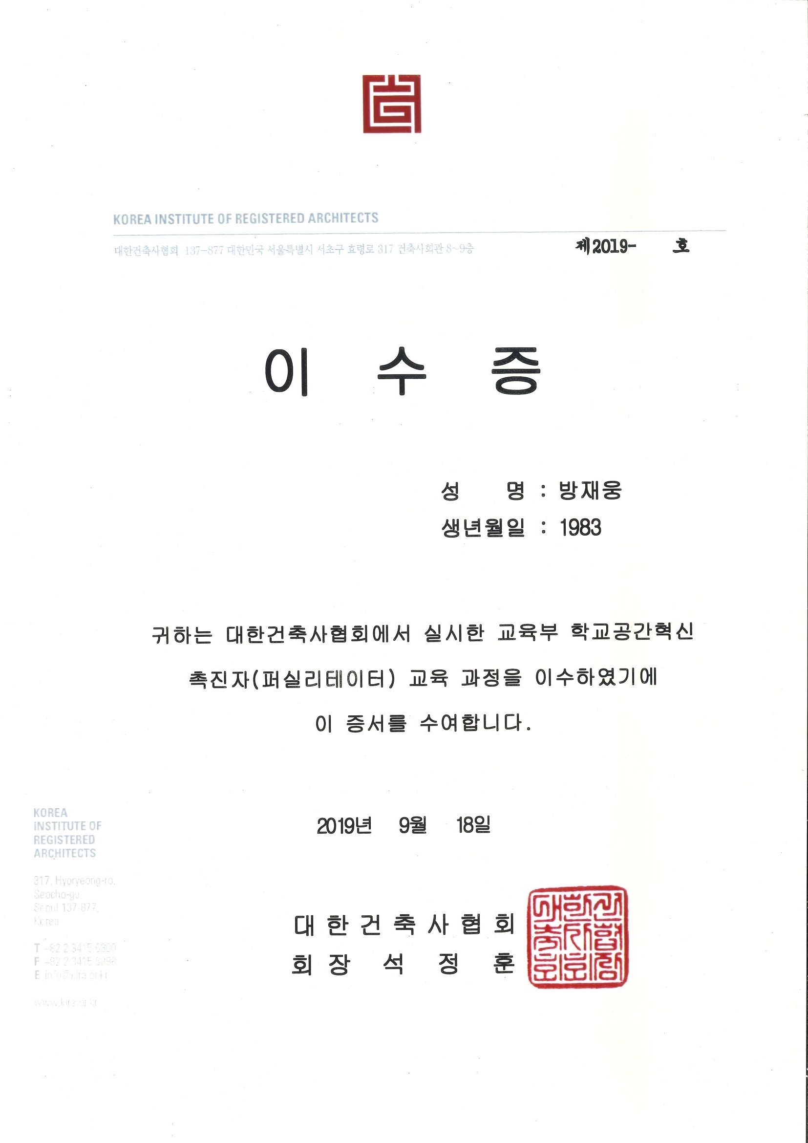 Certificates [대한건축사협회] 교육부 학교공간혁신촉진자 교육이수 2019년 9월 18일 대한건축사협회에서 교육부 학교공간혁신촉진자(퍼실리테이터) 교육과정을 이수하였습니다. 공유하기 게시글 관리 라움 건축사사무소