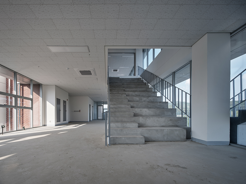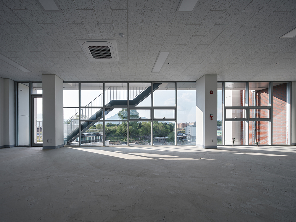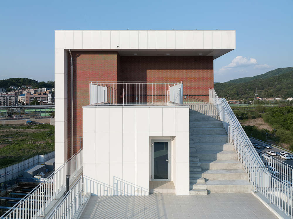 홍수관리지역으로 지하층 물탱크실 설치가 어려운 부분을 극복하기 위해 옥상에 설치한 물탱크실 자체를 디자인 요소로 활용하고자 최상단에는 붉은 벽돌 마감을 적용했다.