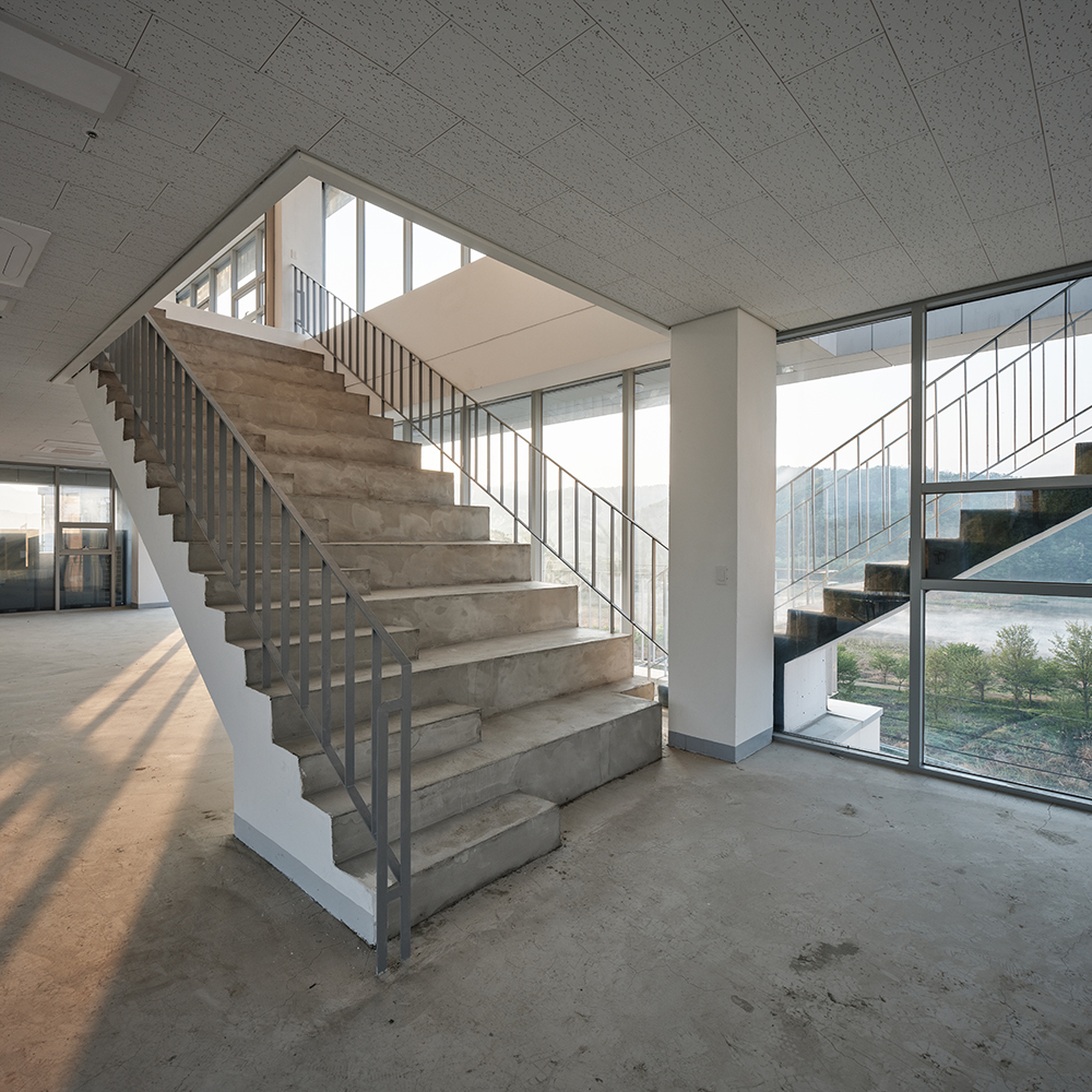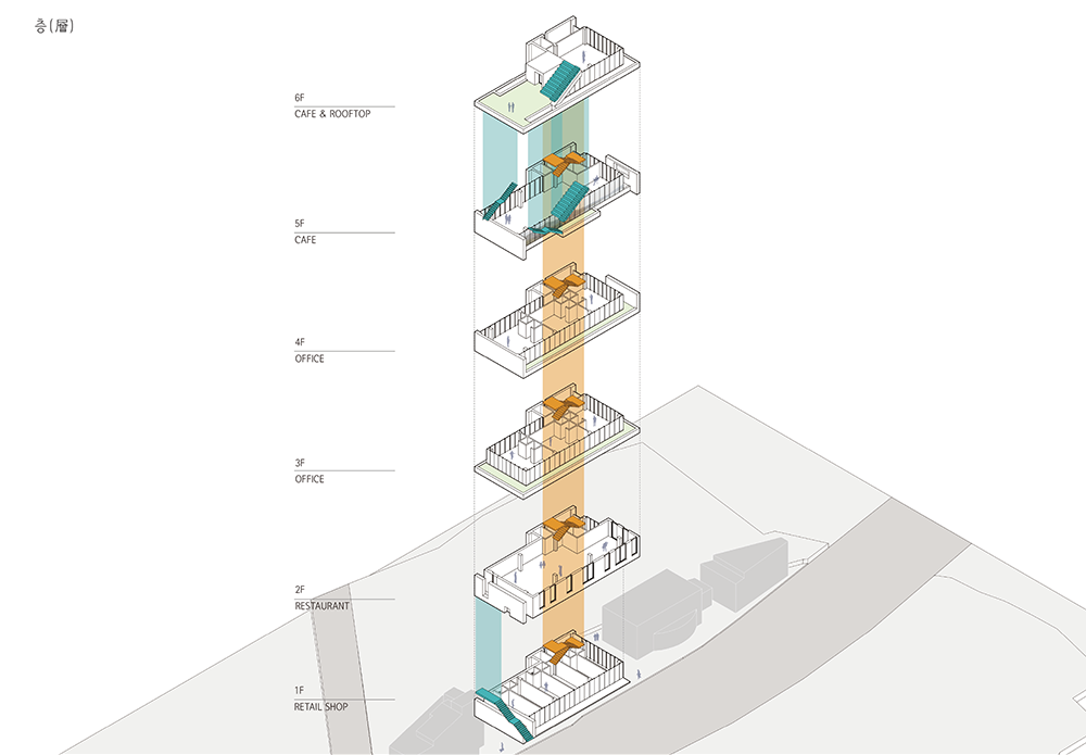 양평 용담리 근린생활시설 ‘층(層)’은 저층에서 고층으로 올라갈수록 남한강이 보이는 뷰를 활용하여 층별로 달라지는 뷰를 극대화한 건물이다. 크게 세 덩이의 매스로 나눠진 건물을 사용시간에 따라 사무소, 카페를 고층으로 배치하고 상가를 저층으로 배치하였다. 이처럼 각각의 층마다 다른 형태와 다른 뷰를 느낄 수 있어 ‘층(層)’이라고 이름 지었다.