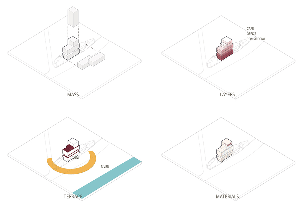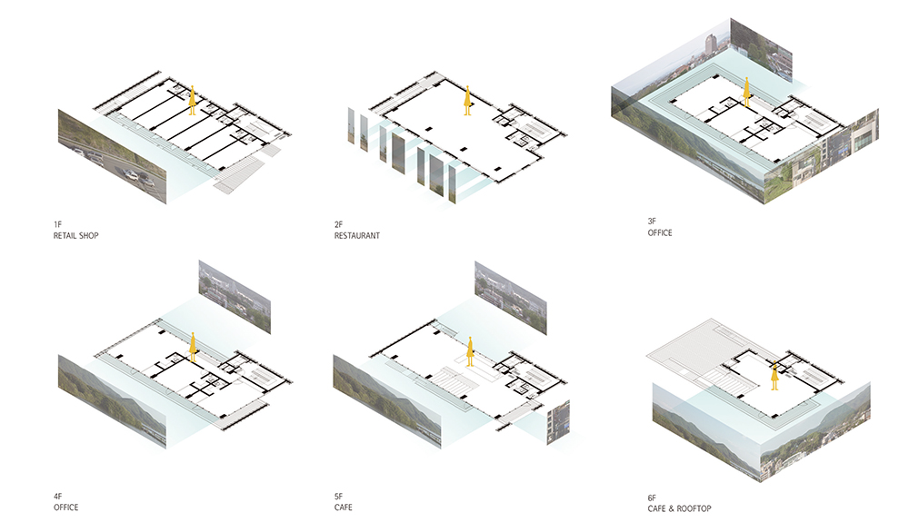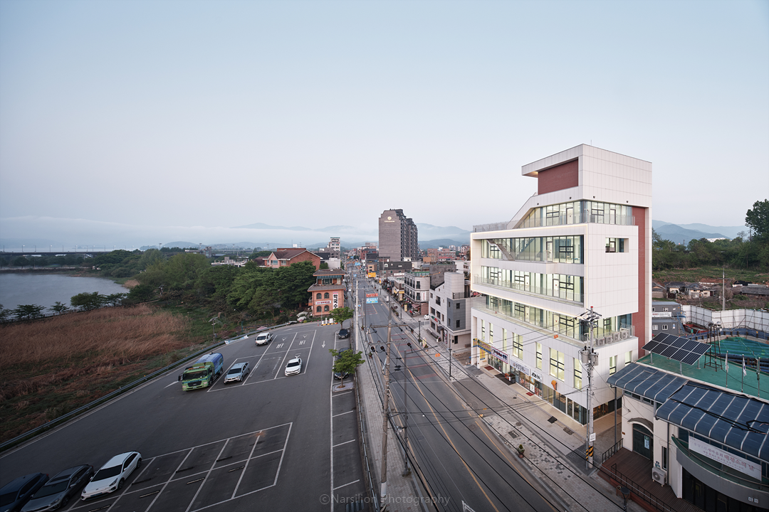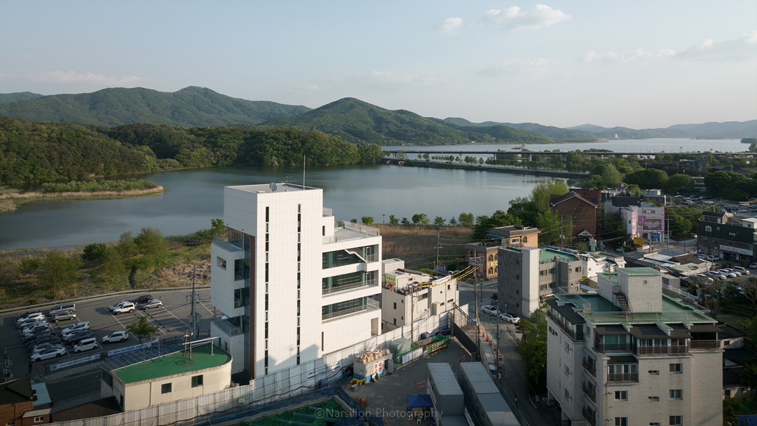 대지는 세미원이라는 관광지와 가깝고, 3층 이상부터는 하천을 조망할 수 있는 위치였다. 대상지는 물론 인접 대지까지 홍수 관리구역에 포함되어 지하주차장 설치가 불가했고, 인접 대지의 건물은 1층 임대공간을 주차장으로 포기할 경우 사업성이 떨어져 3층 소규모 건축물로 신축된 상황이었다. 이에 우리는 대지 내의 잠재력을 최대한 활용하고자 각종 법규를 검토하여 두 개 지역 지구에 걸친 대지의 건폐율 확보방안, 주차장법을 통한 주차장 설치의 대안, 홍수관리지역에 대한 지하층 설비공간 대응 방안을 고민하고 정리하였고, 협의를 통해 해법을 찾아냈다. 더불어 주변 건축물에 비해 많은 층을 쌓아 각 층마다 하천과 강을 바라볼 수 있는 최적의 공간을 만드는 쪽으로 설계 방향을 잡아나갔다.