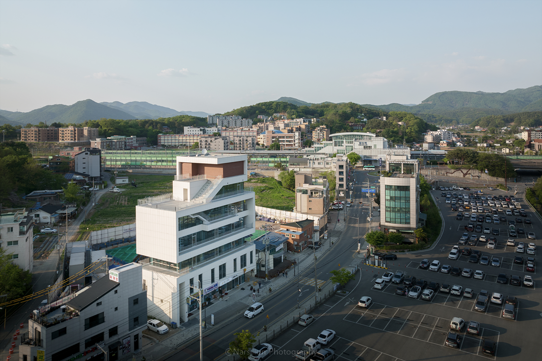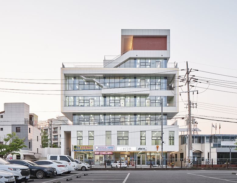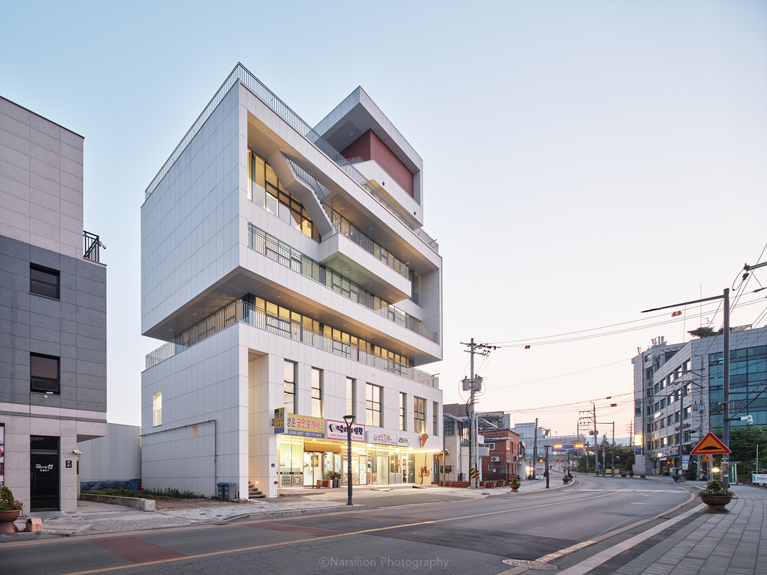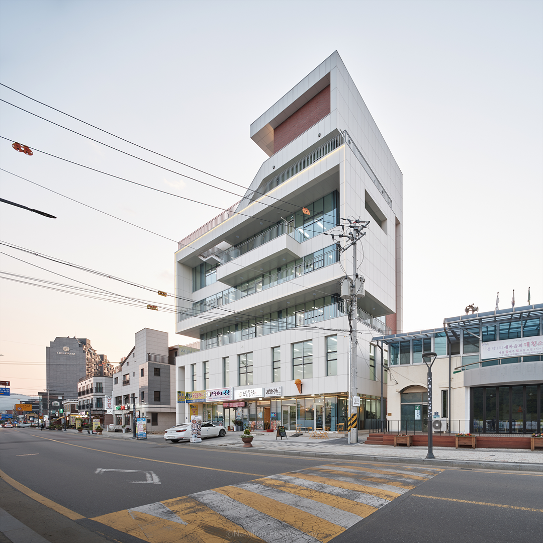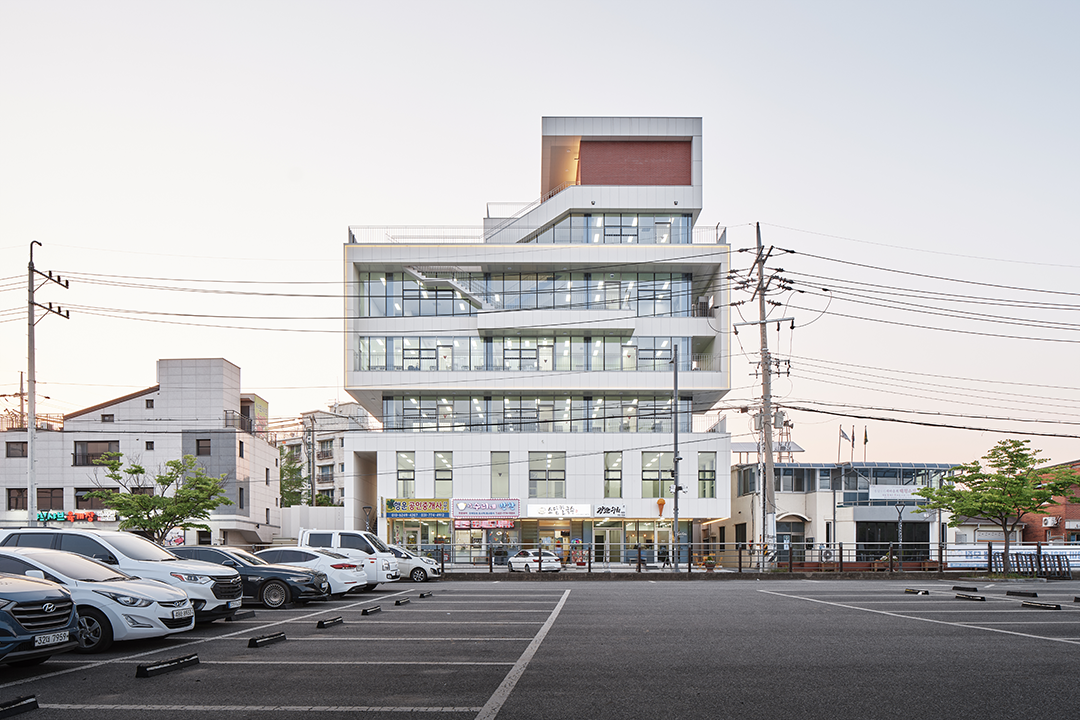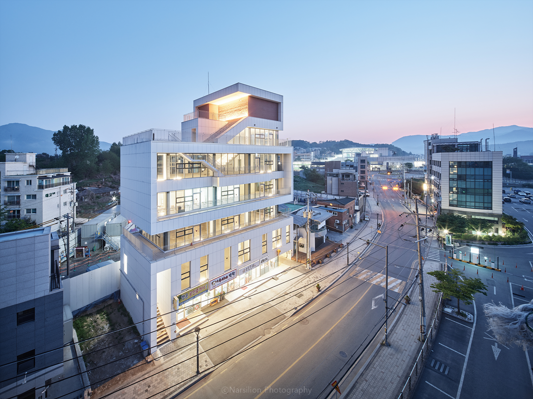 마을 주변의 건축물이 신축되는 과정에서 기존 밝은 색상의 건축물이 사라지고 있는 것을 아쉬워했던 의뢰인을 위해 주변 색상과 조화를 이루는 색상을 사용하고 테라스와 커튼월을 사용하여 대지가 보여줄 수 있는 멋진 풍광을 살림과 동시에 건물의 인지성을 높이는 것을 전체적인 디자인 주안점으로 두었다. 박판세라믹과 커튼월은 빛을 통해 건물과 주변을 더욱더 밝게 빛날 수 있도록 하며, 특히 커튼월을 통한 내부 조명 빛은 더하지도 덜하지도 않게 마을을 은은하게 비춰준다.