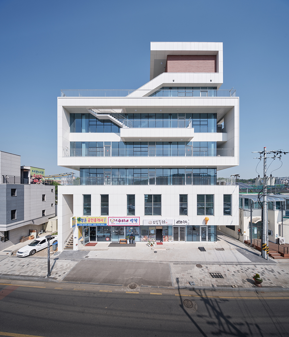 3층 규모를 계획하여 1층을 분할 임대하고, 2층에 식당을 직영으로 운영할 생각이었던 의뢰인. 이에 우리는 2층에 대한 접근성을 개선하기 위해 2층 전용 출입구를 인지할 수 있도록 배치하고, 식당 테이블에 맞추어 저층부의 디자인을 조정했다. 또한 상층부의 경우 저층부와 달리 마을 주민들을 위한 공간으로 사용하길 바랐기 때문에 테라스 등을 활용하여 일반적인 근린상가와 달리 각 층마다 다른 디자인을 적용했다.