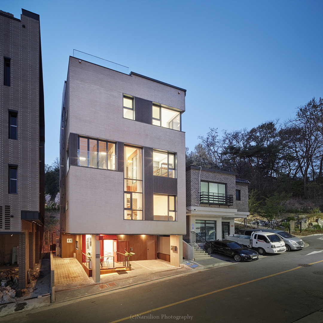 2층과 3층을 사용하는 건축주 세대의 어린 자녀들이 층간소음 걱정 없이 뛰어놀 수 있도록 필로티 부분에 주 생활공간인 거실과 주방을 두었고, 공원 쪽을 바라보는 방들은 정적인 활동이 가능하도록 프라이빗한 공간으로 구성했다.