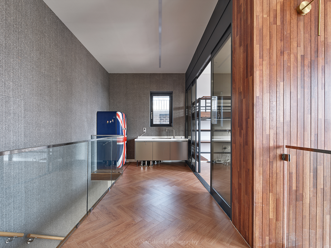 부모님 세대의 경우 2인 거주 공간에 맞추어 평면을 구성하였다. 개방감 있는 창호와 높은 천정고 등을 통해 기존 거주 주택보다 작지만, 활용성 좋은 공간으로 만들었다. 이에 더해 최상부에는 외부 테라스와 다락 공간을 배치해 옥상 공간의 활용성과 접근성을 높였다. 옥상 공간은 2세대가 만나 이야기를 나눌 수 있는 커뮤니티 공간이 될 것이다.