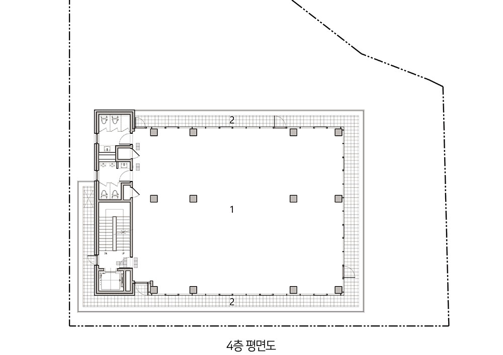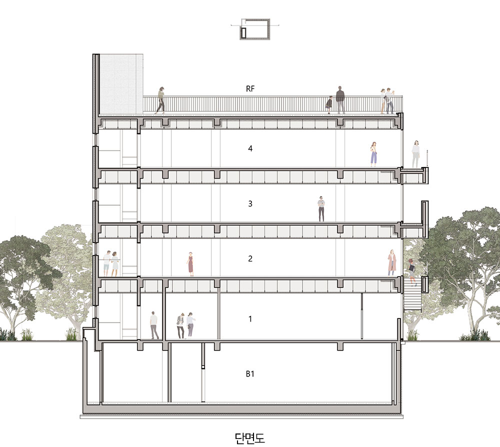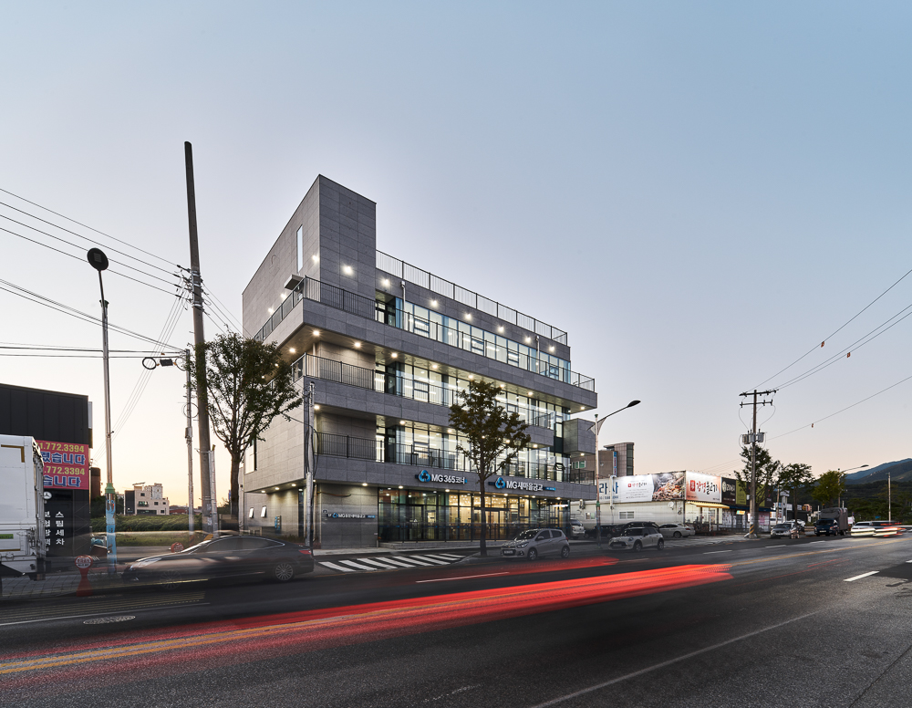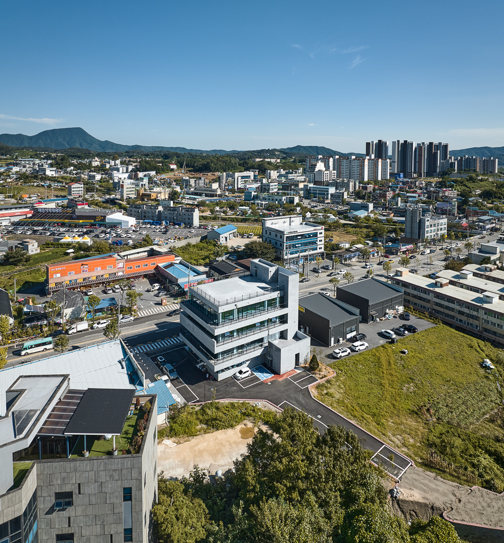 전면부에는 대로변에서 차량과 보행자의 접근이 용이하도록 남동향으로 길게 배치하고, 차량의 진입도로가 대지와 제일 가깝게 하여 주차장을 건물 뒤편에 배치했다. 또한 근린생활시설 용도로 사용할 건물이기에 테라스 쪽에 2층 상가로 바로 진입할 수 있는 동선을 만들어 업무시설과 상가 동선을 분리하였다.