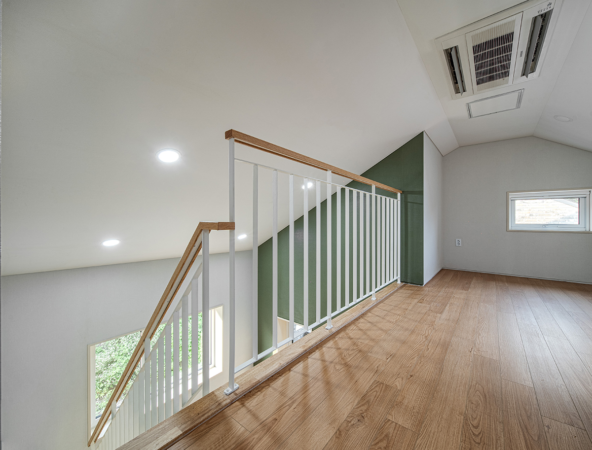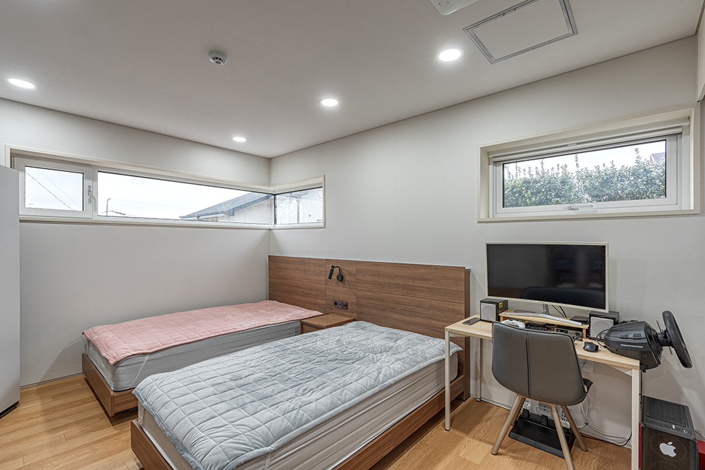 자녀방 계획 시 가장 중점을 둔 부분은 두 자녀의 생활패턴이 달라 서로 공간에 영향을 주지 않도록 하는 것으로, 방을 대각선으로 배치하여 최대한 방 사이에 거리를 확보했으며, 이를 통해 외부 테라스와 다락공간이 서로 간에 공평하게 대칭으로 구성될 수 있었다.
