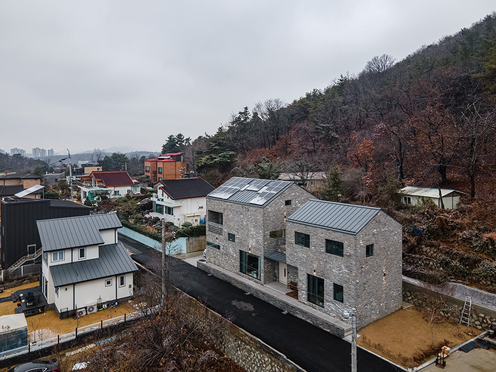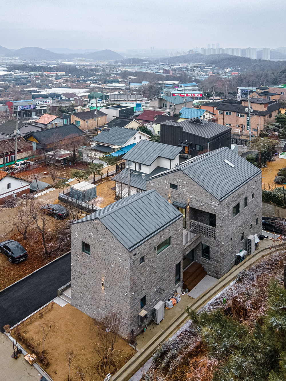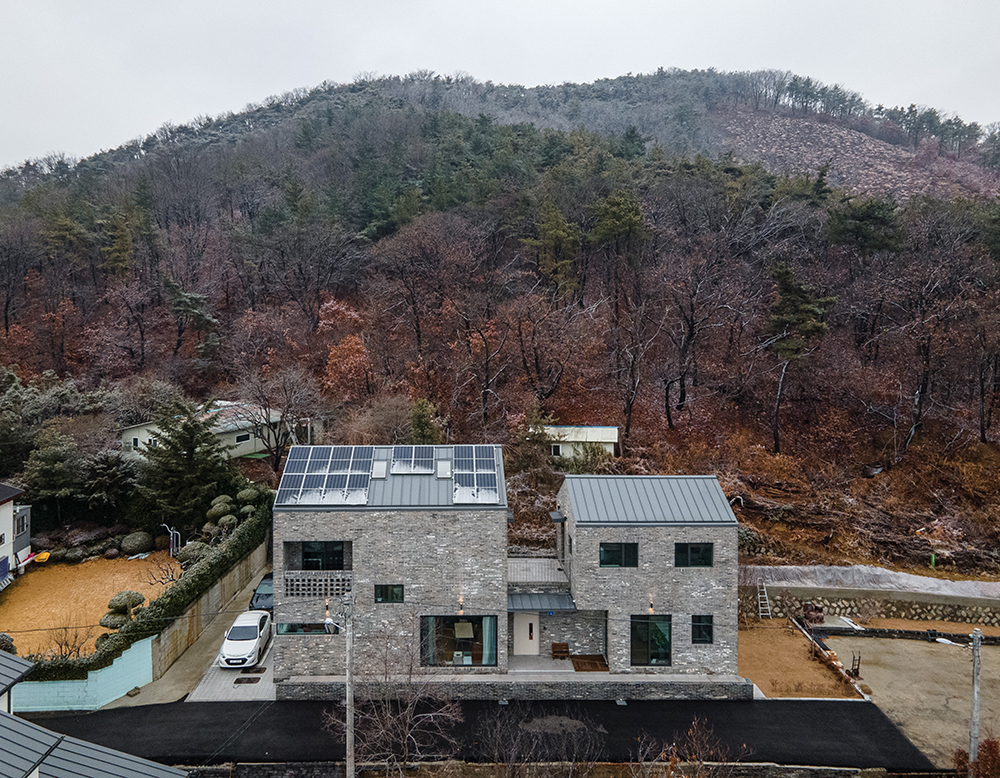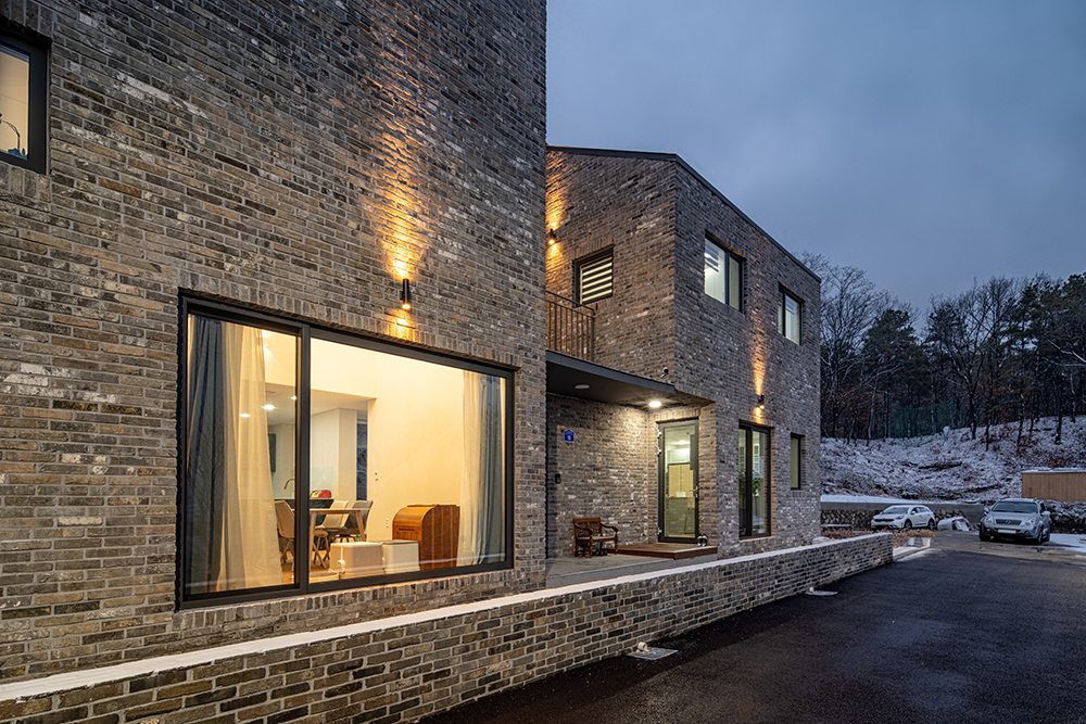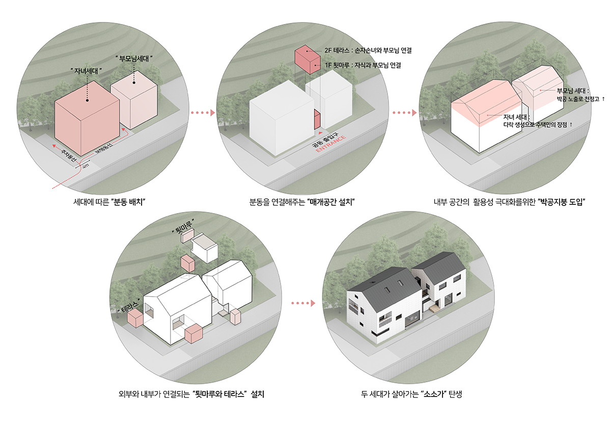 심플한 박공 형태를 통해 전체적인 외피 면적을 최적화하였고, 내부 오픈부를 통해 거실의 공간감을 살리면서 추후 필요에 의한 증축이 이루어질 수 있도록 계획하였다. 두 개의 동 사이를 이어주는 1층 툇마루 공간을 통해 주택 내부에 채광과 개방감을 주고, 손자 손녀와 부모님을 연결해 주는 매개공간 역할을 하는 2층 테라스를 활용하여 두 세대의 소통공간을 만들었다.