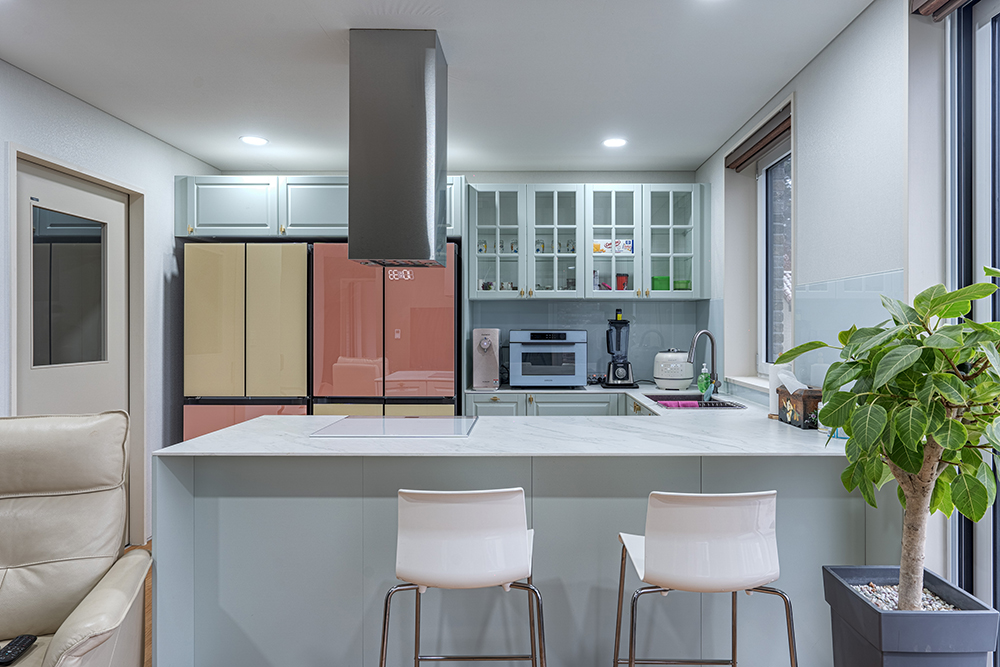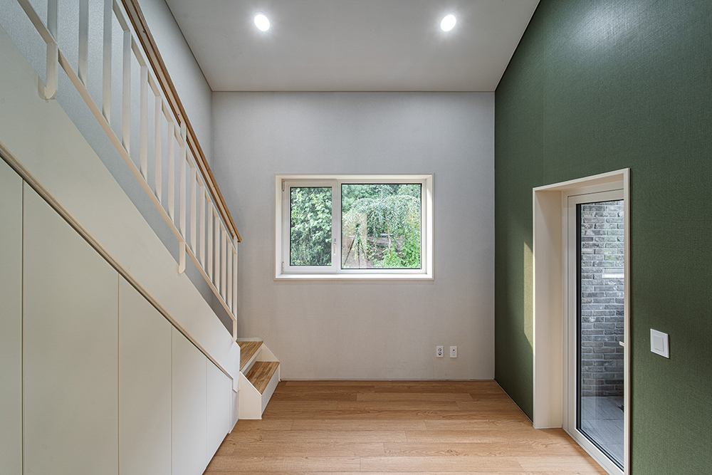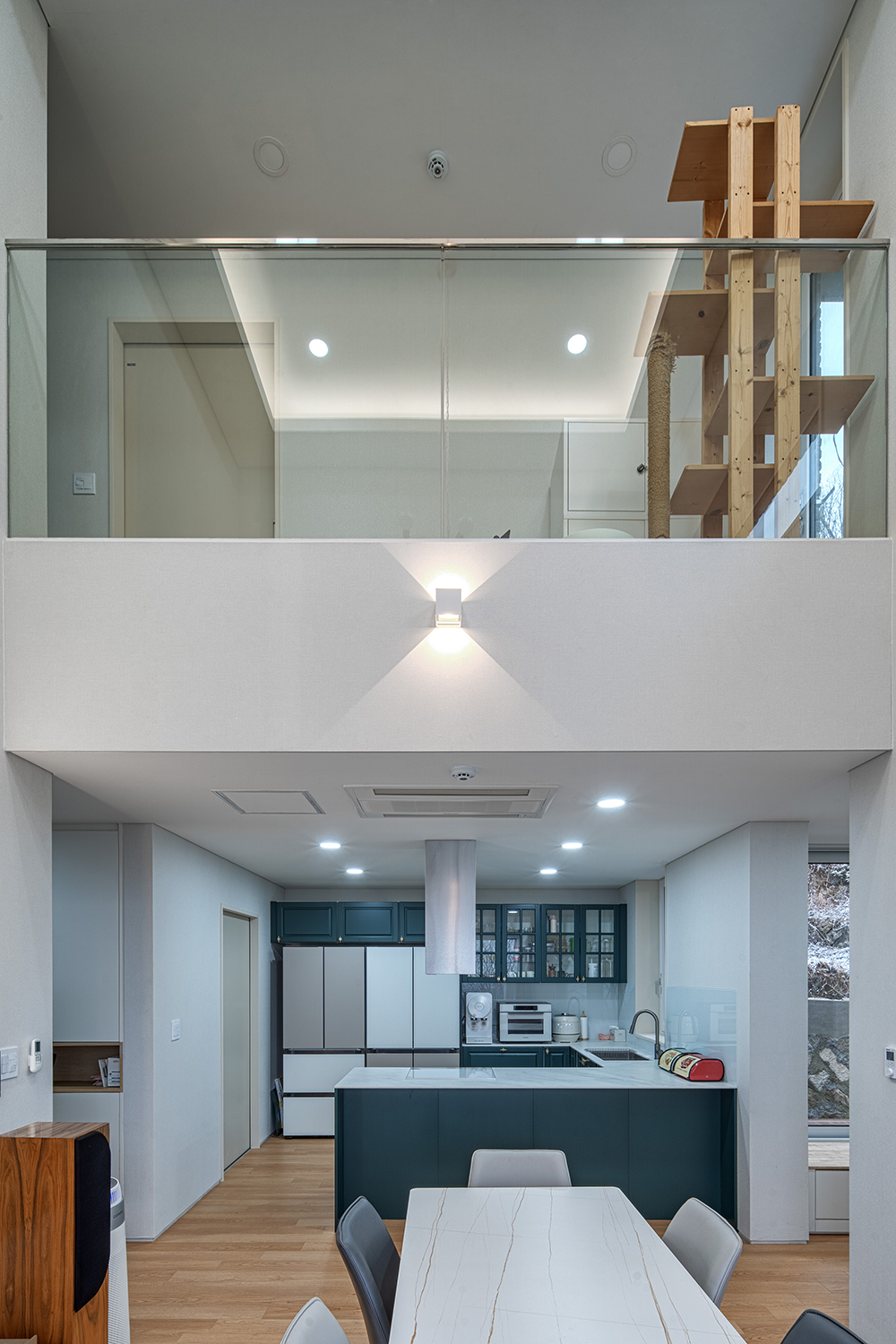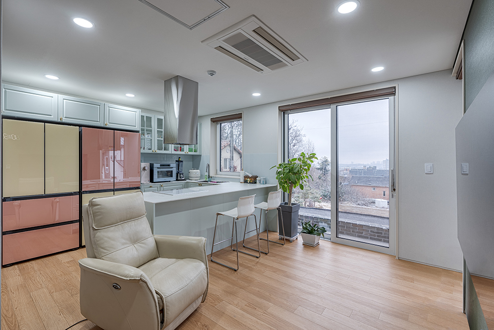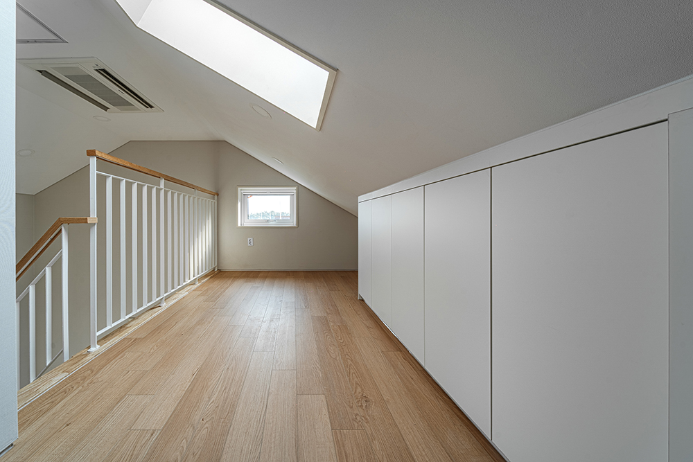 거실의 경우 자재비 상승으로 인한 공사 면적을 최적화하는 과정에서도 상부 오픈 부분을 포기하지 않고, 기존 거주공간에 비해 좁은 거실에 상부를 열어 개방감을 확보했다. 또한 시간이 지나 자녀들이 크고, 짐이 많아져 내부공간이 부족해질 경우를 고려해 2층 공간의 확장이 가능하도록 구조설계를 진행하였다.