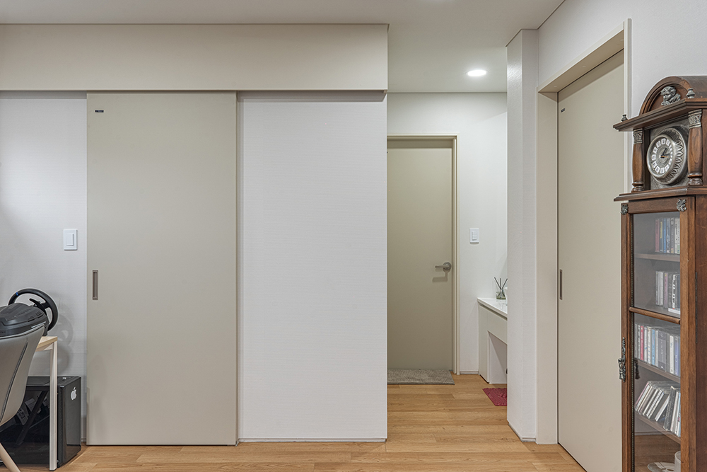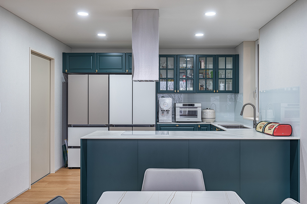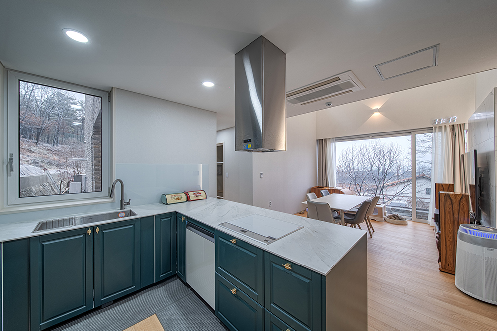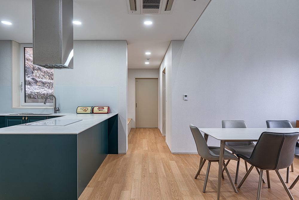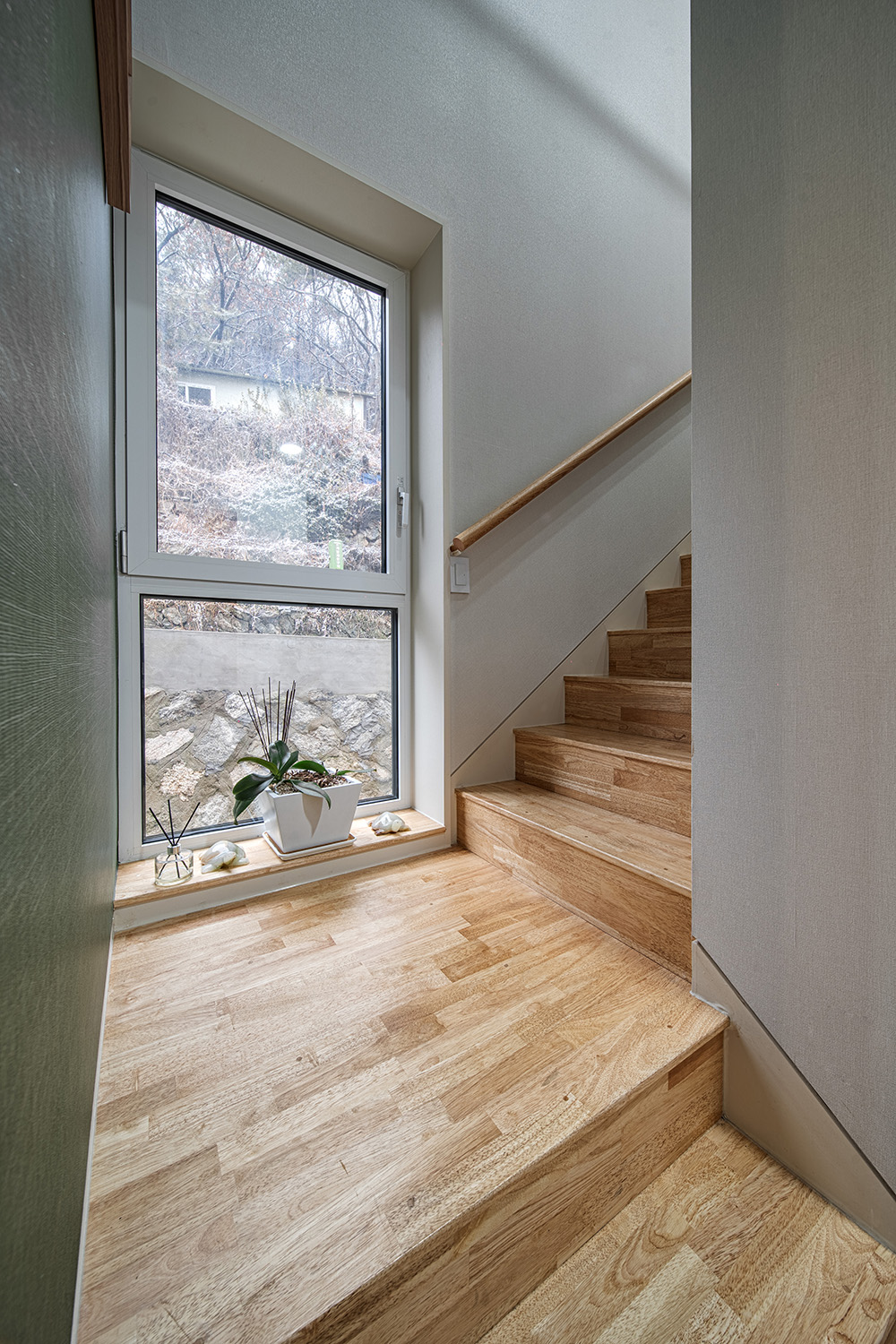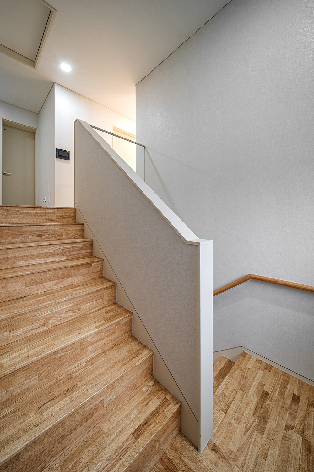 거실의 경우 자재비 상승으로 인한 공사 면적을 최적화하는 과정에서도 상부 오픈 부분을 포기하지 않고, 기존 거주공간에 비해 좁은 거실에 상부를 열어 개방감을 확보했다. 또한 시간이 지나 자녀들이 크고, 짐이 많아져 내부공간이 부족해질 경우를 고려해 2층 공간의 확장이 가능하도록 구조설계를 진행하였다.