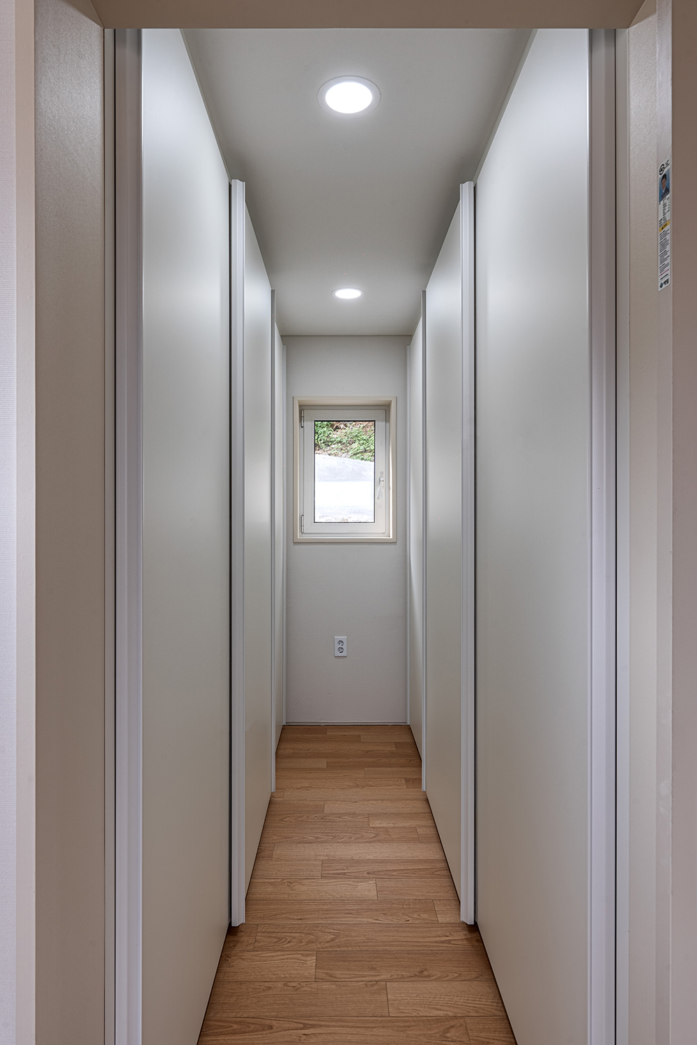처음 설계 당시에는 방 사이의 벽체를 개방하여 아이들이 순환하면서 놀 수 있는 공간으로 계획하였으나, 건물 연면적의 조정으로 방의 가구 배치가 원활하지 않아 중간 벽체는 비내력벽으로 남기고 추후 벽을 터서 큰 방으로 구성할 수 있도록 가변적인 공간 구성이 가능하게 계획했다.