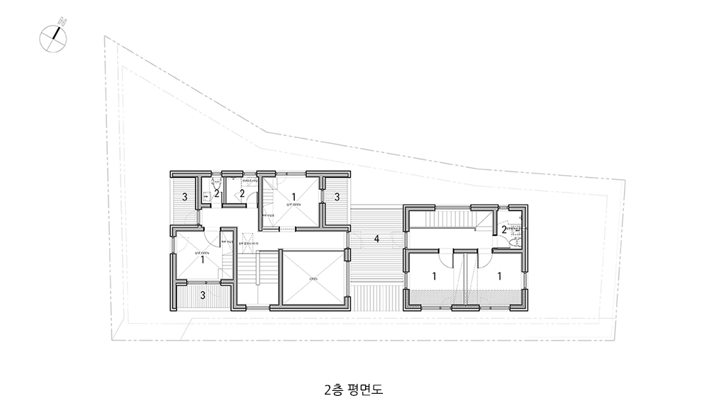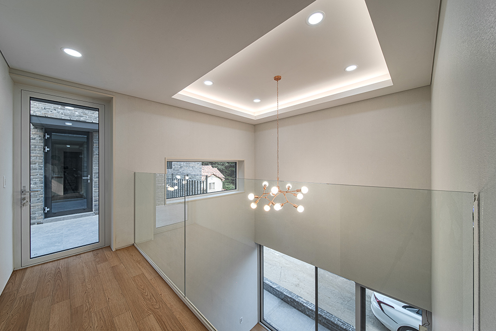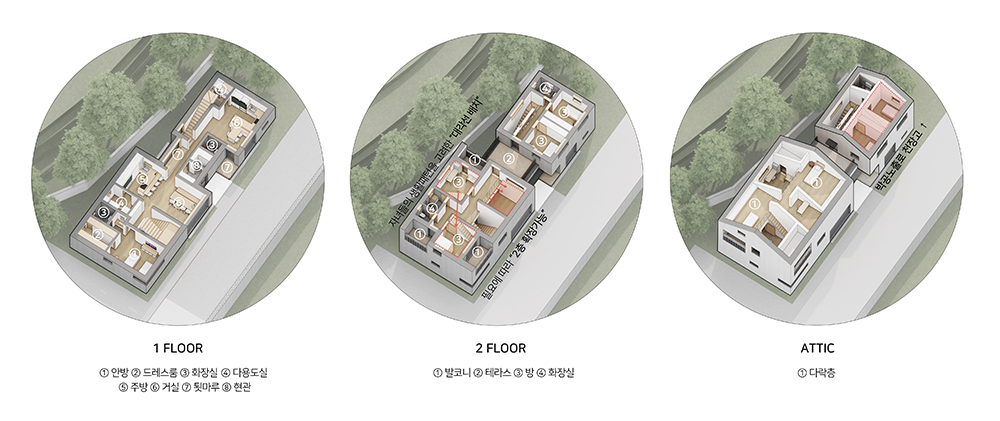 부모님과 부부, 그리고 자녀까지 3세대가 거주하는 주택이 되기 때문에 각각의 세대별로 공간을 배치하는 데에 중점을 두었다. 먼저 부모님의 경우 주로 거실과 마당에서 주 생활을 하시고, 각자 방을 사용하시길 선호하셨기에 현관을 중심으로 우측에 1층과 2층을 모두 사용하는 한 동으로 부모님 공간을 구성했다. 건축주 부부가 주로 사용하는 공간은 부모님과 자녀들과의 소통을 위해 집의 메인 위치에 배치하고, 1층 거실, 주방과 가까운 대신 프라이버시 보호를 위해 계단과 다용도실을 통해 공간을 구분하였다. 마지막으로 자녀 방의 경우 부부와 같은 동이지만 계단을 통한 수직분리를 통해 자녀 방의 독립성을 주고, 아파트에서 가질 수 없는 천정과 다락, 테라스를 공평하게 배치했다.