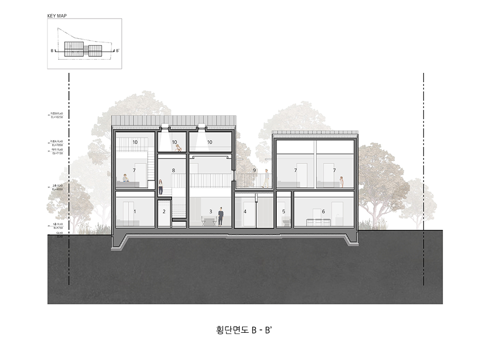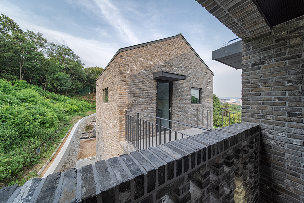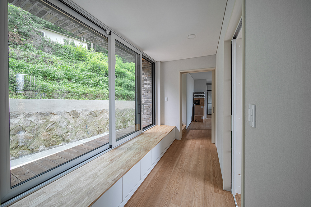 산을 깎아서 만든 주택지로 주택 필지별 3~4m 높이의 단차를 가지고 있었고, 대지는 그중 가장 높은 곳에 위치했다. 특히 기존 주택의 경우 지어진 지 오래되어 개발제한구역과 대지 사이의 경계가 모호하고 산에서 내려오는 우수가 석축에 미치는 영향이 상당해 보여, 대지를 높이거나 낮추기에는 토목공사의 비용이 많이 증가할 것으로 예상되었다. 따라서 기존 대지 조건을 최대한 살리는 범위 내에서 주택을 계획하였다.
