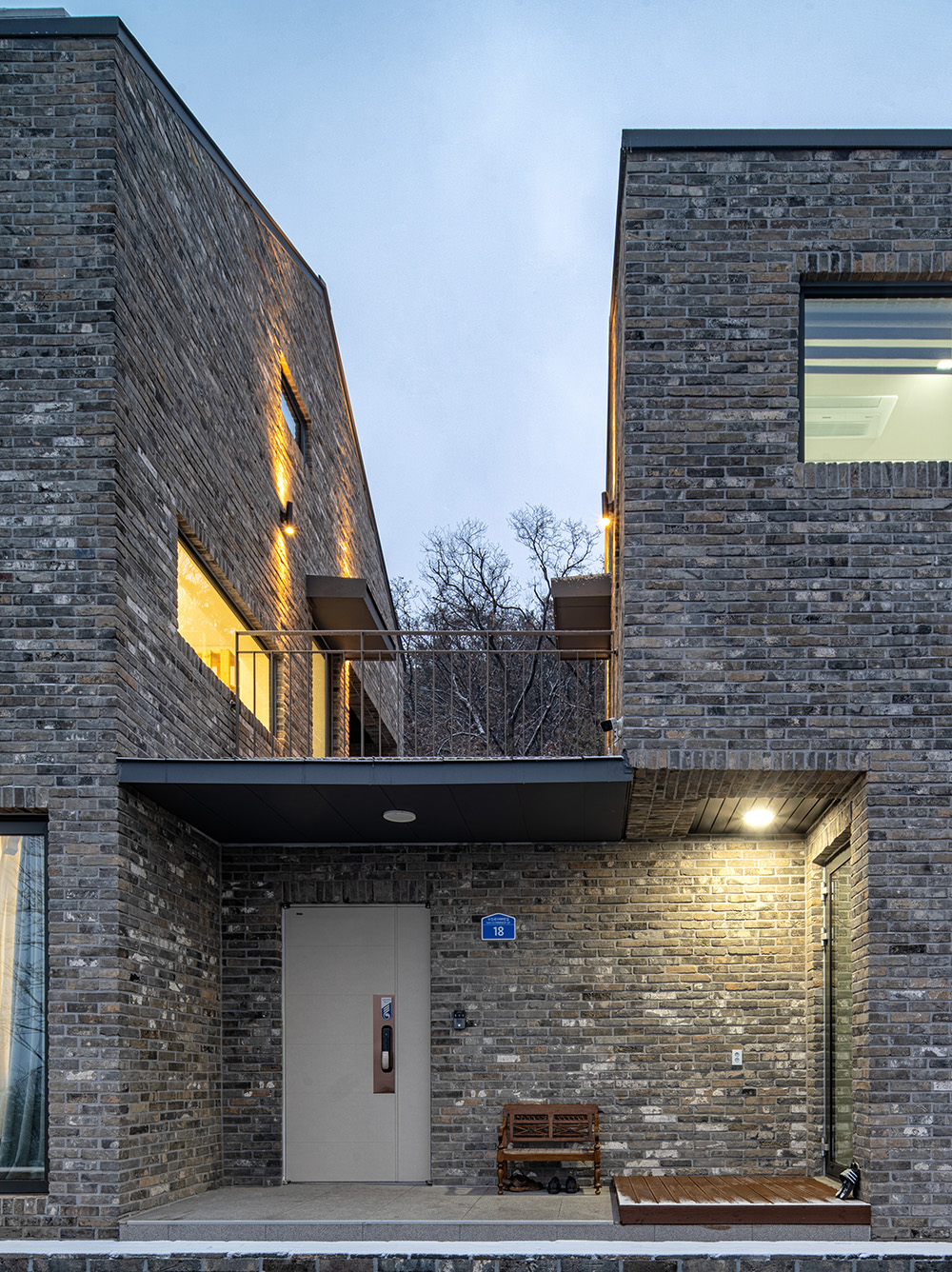 지구단위계획상 정남일조를 받는, 그리고 인접 대지가 바로 길게 붙어있어 일조사선의 제한을 많이 받는 “ㅡ”자형 땅은 도로에 접한 4m 길이에 출입구(차량, 보행)가 설치되어야만 했고, 필로티를 고려하기에는 1층 공용공간의 손해가 더 컸다. 따라서 남은 공간에 주택을 설계하고, 공사비를 최적화하기 위해 형태를 심플하게 구성했다.