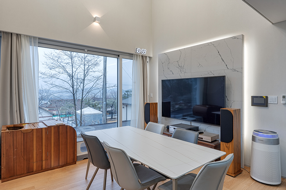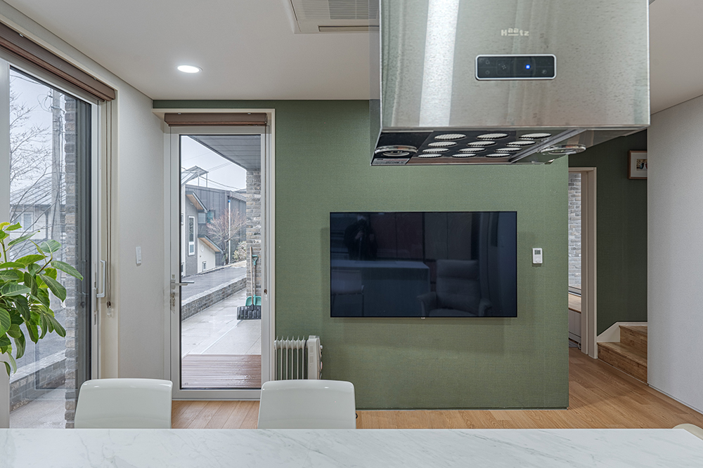 더불어 기존의 주거 형태(아파트)에서 잘 경험하지 못한 마당공간을 확보하여 부모님 세대의 거실 벽에 창을 두지 않아 빔프로젝트를 사용한 가족들 간의 커뮤니티공간 및 티테이블을 통한 휴식공간과 포켓정원과 텃밭으로 활용할 수 있도록 했다.