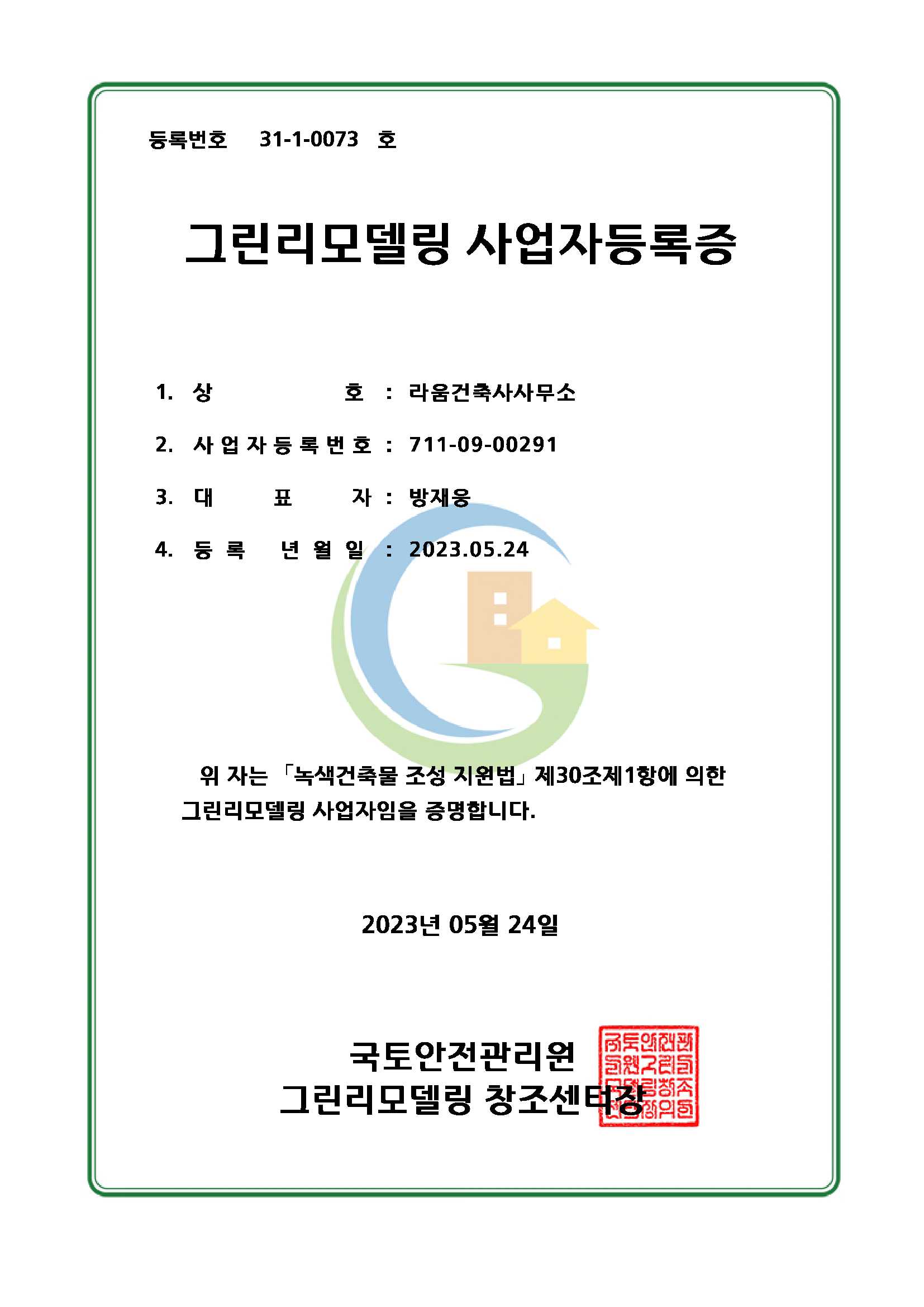 Certificates [국토안전관리원] 그린 리모델링 사업자 등록증 2023년 5월 24일 라움건축사사무소가 국토안전관리원의 그린리모델링 사업자로 등록되었습니다. 공유하기 게시글 관리 라움 건축사사무소