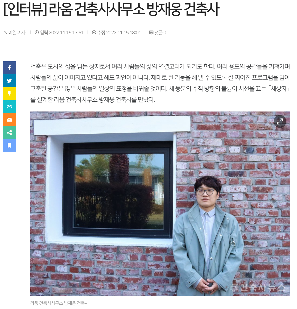 2022년 11월 15일 건축사뉴스 인터뷰 기사가 소개되었습니다.