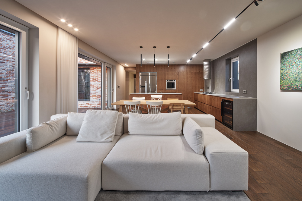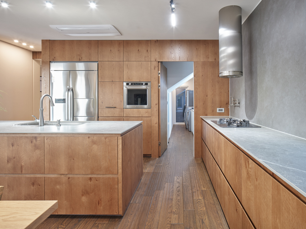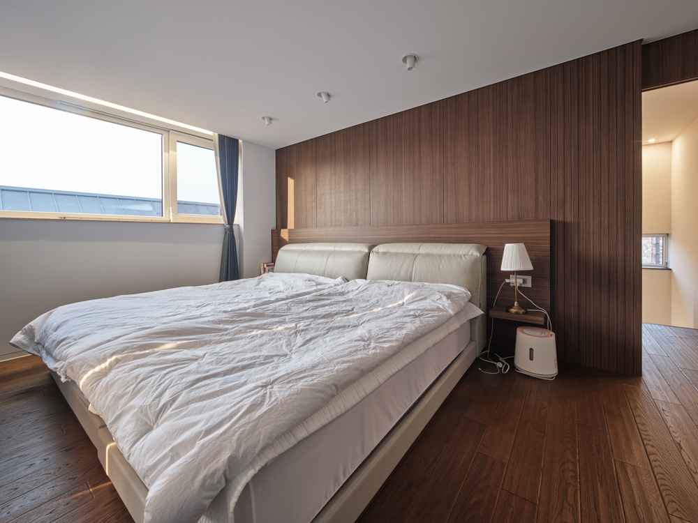 부부공간은 2층으로 공용 공간과 사적 공간으로 구분했다. 언니공간과 바로 연결되는 1층에 주방, 거실 같은 공용 공간을 두고, 부부의 사적 공간은 2층에 배치했다. 주 생활공간 뒤편의 테라스는 부부만의 개인적인 외부 공간이다. 거실, 주방, 식당은 내부가 넓어 보이도록 구획 없이 하나의 공간으로 구성했고 전면의 툇마루까지 확장될 수 있게 넓은 통창을 설치했다. 2층 화장실은 건축주의 로망이던 욕조에서 풍경을 보며 누리는 휴식 시간을 위해 코너창을 만들었다.