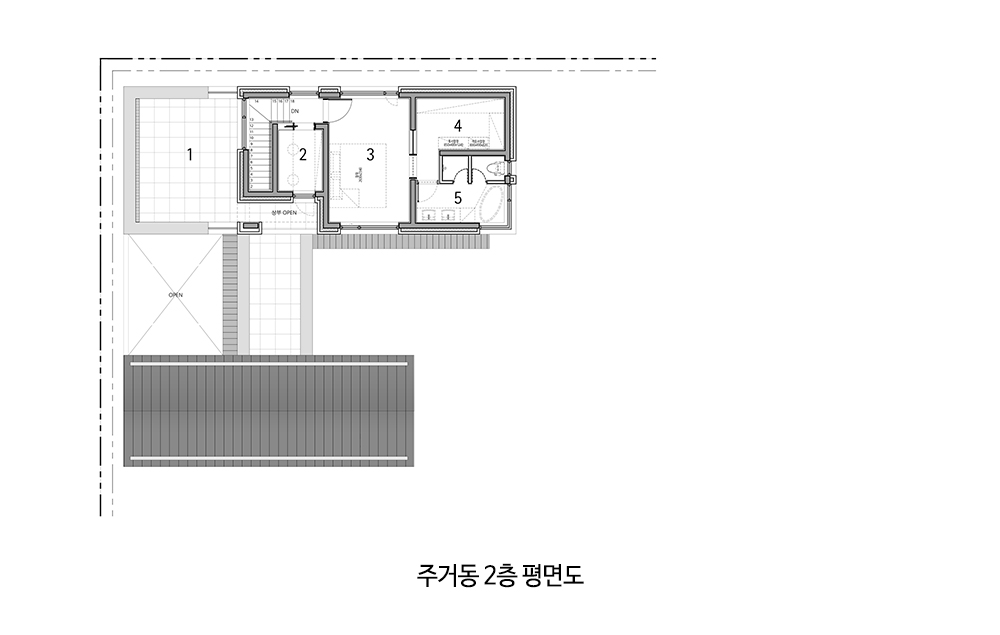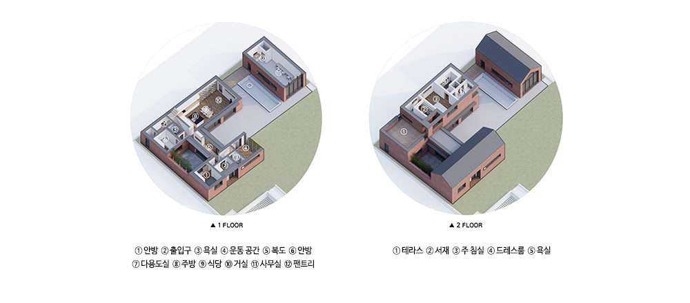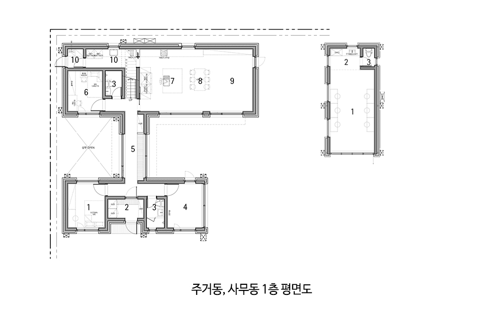 주거동 ① 침실 ② 현관 ③ 욕실 ④ 운동 공간 ⑤ 복도 ⑥ 게스트룸 ⑦ 주방 ⑧ 식사 공간 ⑨ 거실 ⑩ 다용도실