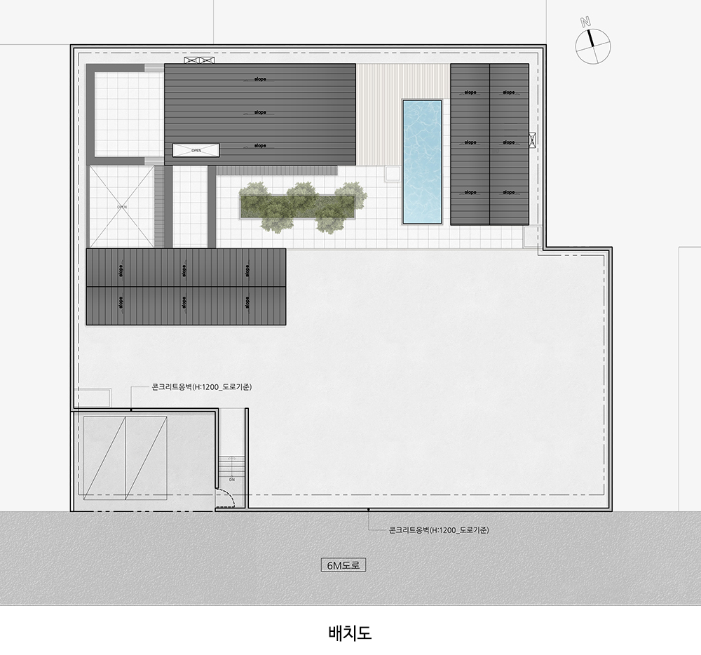 대상지는 농지로 사용하던 260평의 대지로 우수관로와 전기‧통신 등의 기반시설 공사가 진행 중이던 대지로 주변의 주택지와 떨어져 있었고, 대지는 정면으로 트여 도시에선 찾을 수 없는 개방감이 느껴졌다. 건축주가 이 대지를 선정한 이유를 알 수 있었다. 우리는 보전관리지역 내 필지에 2개의 건축물을 지어야 하는 상황에서 건폐율 20%라는 한계를 어떻게 극복할지가 고민이었다. 여기에 도로와 인접 대지 간의 완만한 경사를 활용할 수 있을까 생각하면서 현장 답사를 마무리했다.
