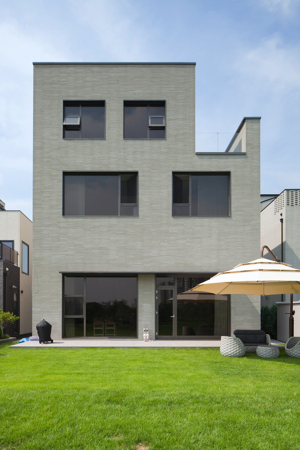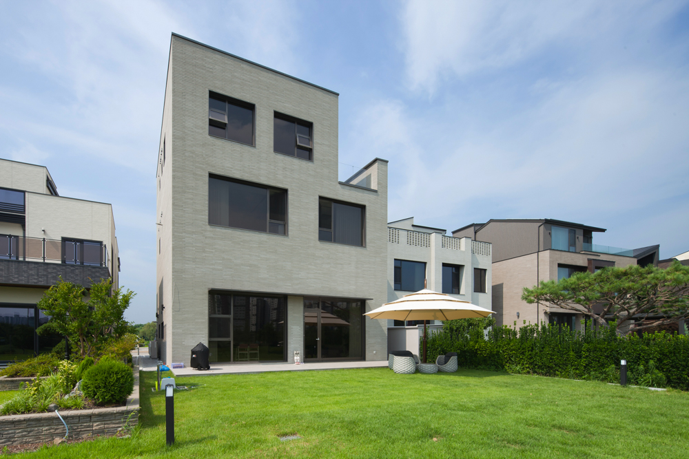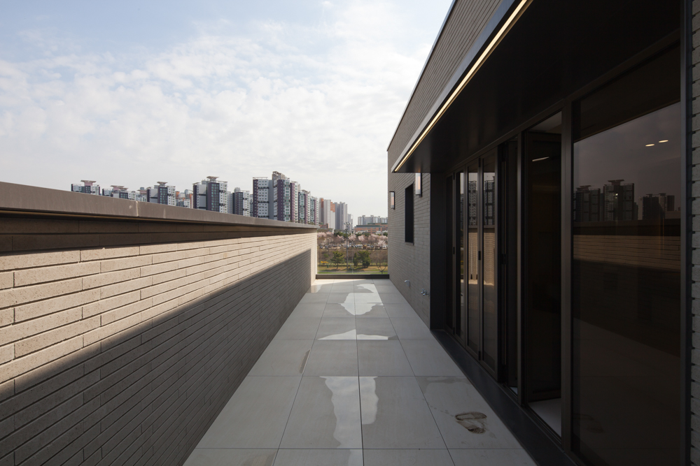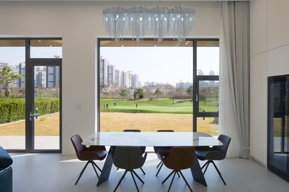 해서 공간 구성 또한 주어진 환경과 건축주의 요구를 따라 단순하게 계획했다. 층별로 공용 공간, 부부의 공간, 자녀의 공간을 분리하고 각 층의 핵심 공간은 모두 조망을 고려해 남향으로 배치했다. 골프장의 푸른 전경을 끌어들이는 남향의 큰 창과 달리, 도로에 면한 북측 면은 프라이버시 보호를 위해 얇고 긴 창을 두어 상반되는 입면 디자인을 완성했다.