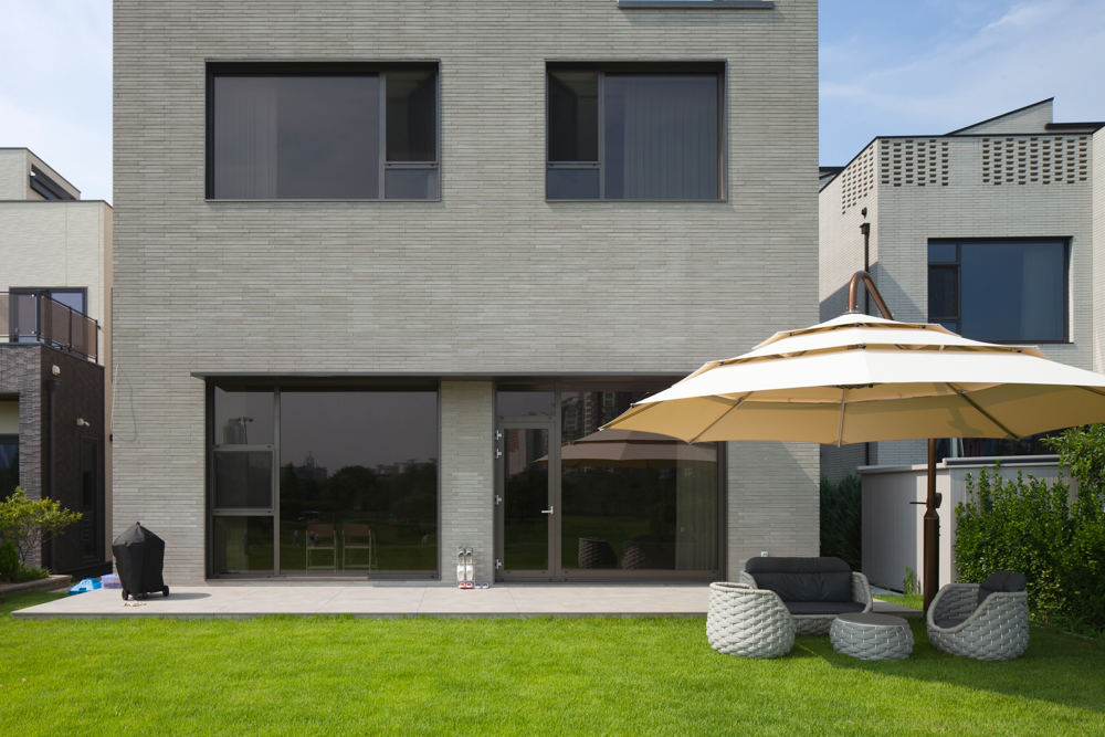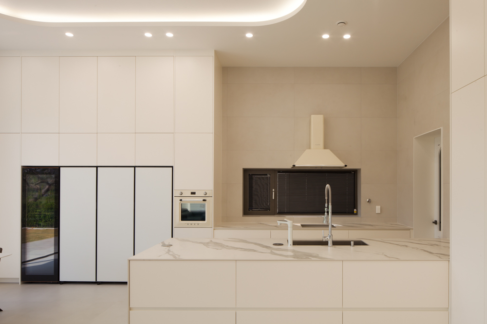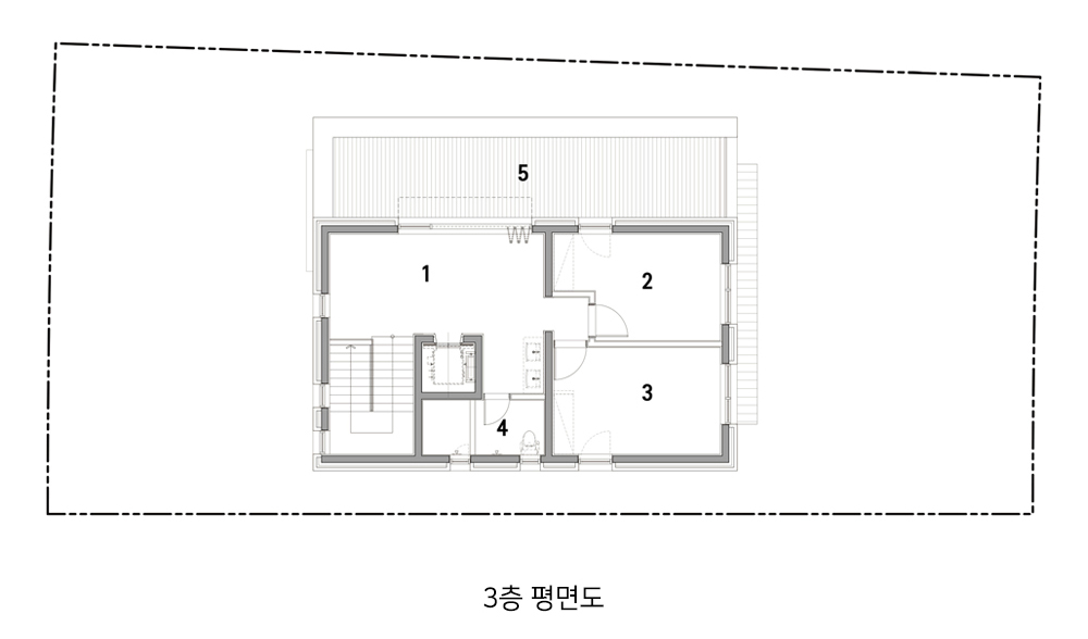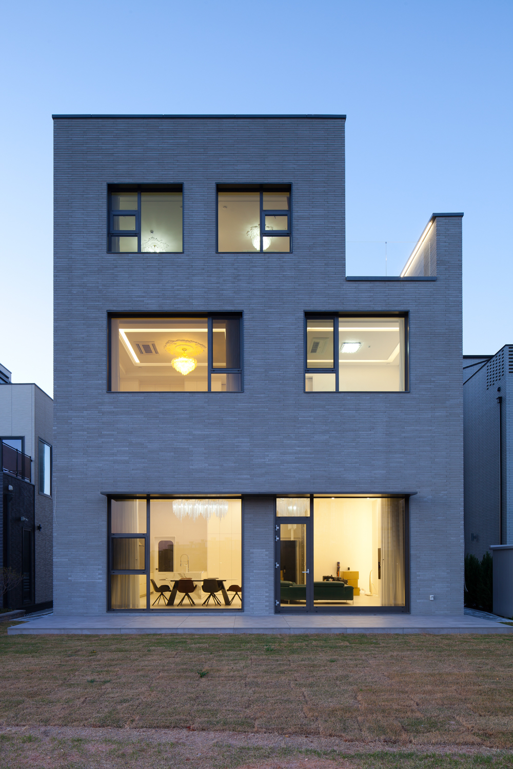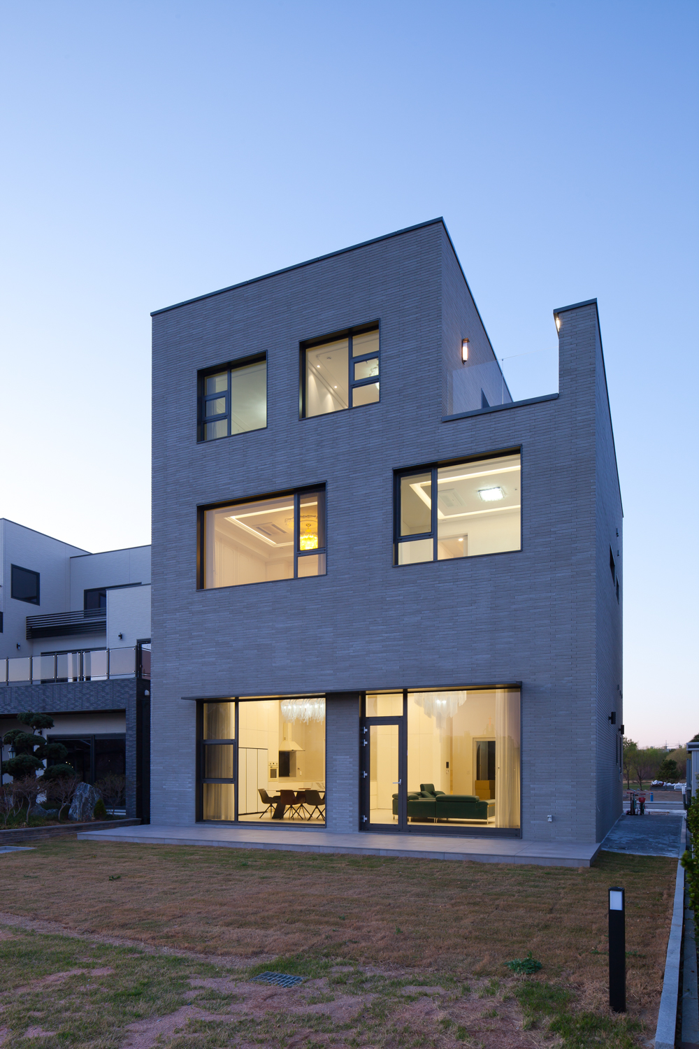 해서 공간 구성 또한 주어진 환경과 건축주의 요구를 따라 단순하게 계획했다. 층별로 공용 공간, 부부의 공간, 자녀의 공간을 분리하고 각 층의 핵심 공간은 모두 조망을 고려해 남향으로 배치했다. 골프장의 푸른 전경을 끌어들이는 남향의 큰 창과 달리, 도로에 면한 북측 면은 프라이버시 보호를 위해 얇고 긴 창을 두어 상반되는 입면 디자인을 완성했다.