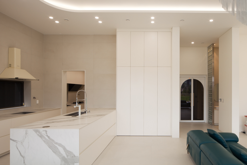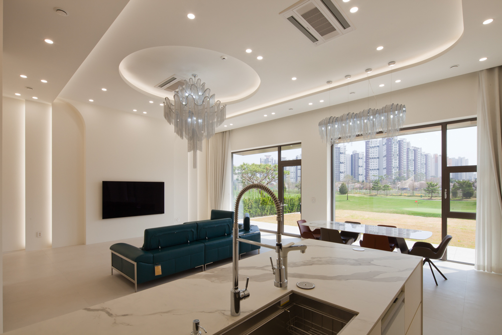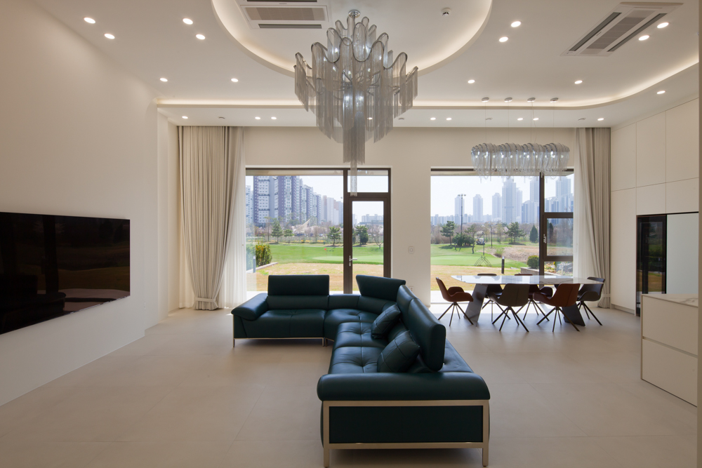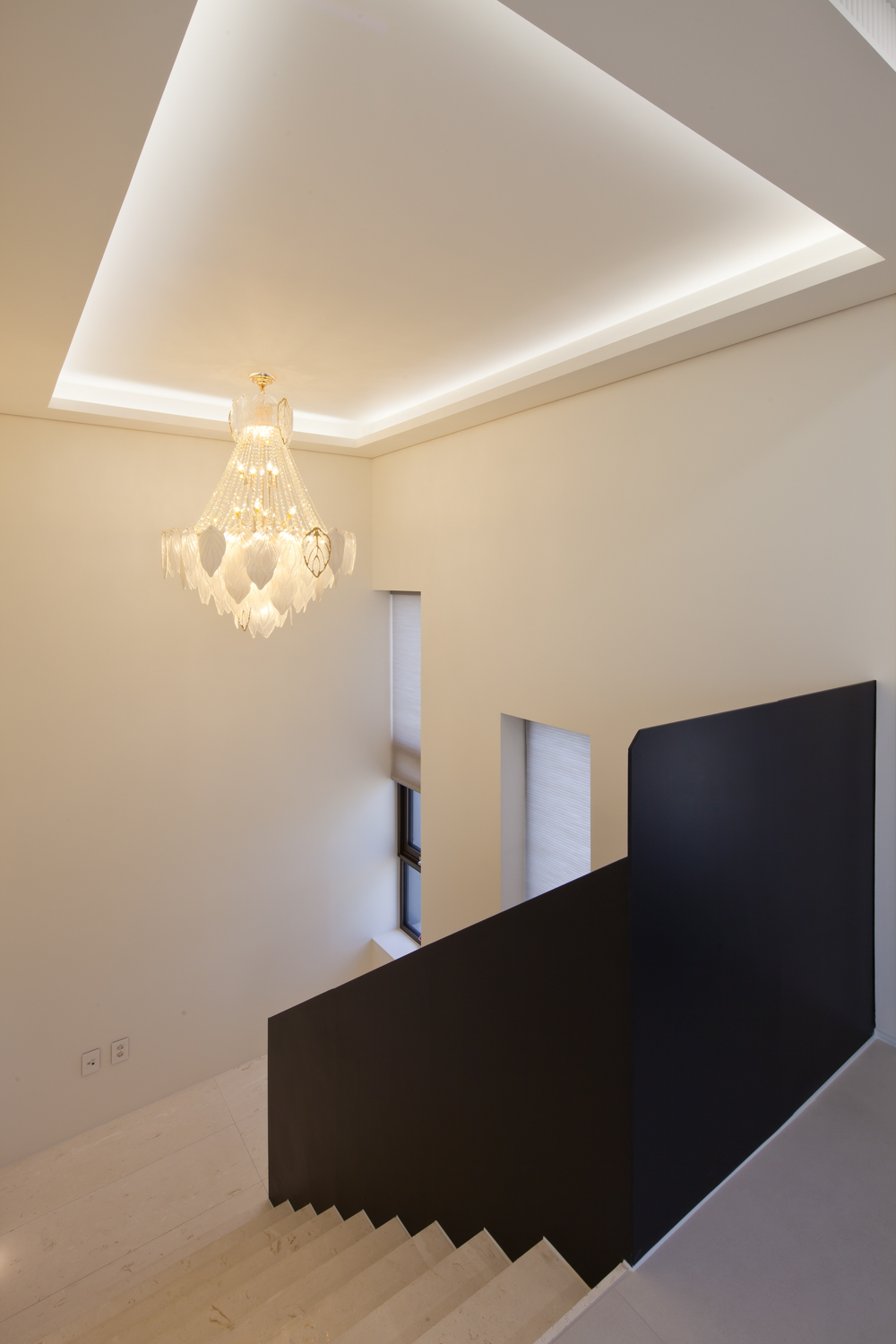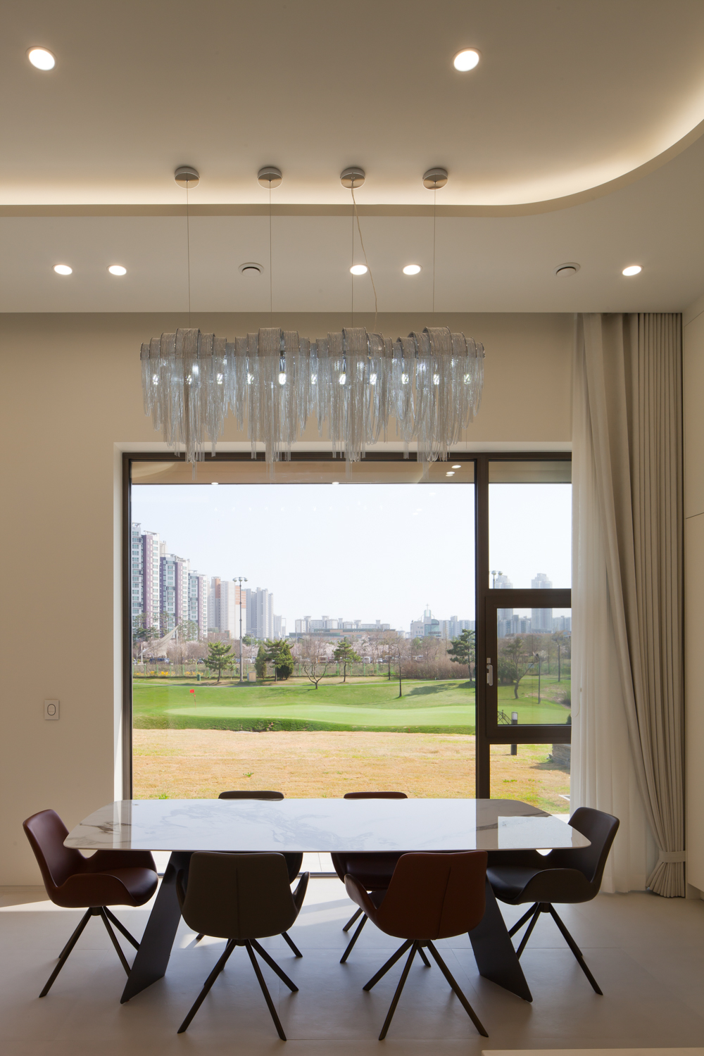 부부는 원래 거주 형태인 아파트와 차별화된 공간을 원했는데, 특히 가능한 한 넓고 단순한 공간을 바탕으로 화려한 인테리어 요소를 가득 채우려는 구체적인 계획이 있었다. 또한 대지의 가장 큰 이점인 골프장 전망을 최대한 누릴 수 있는 쾌적한 환경을 조성해달라는 요구도 있었다. 이를 바탕으로 더 라운지를 계획할 때 ‘장식 요소를 방해하지 않는 건축’, ‘높은 층고로 기존 아파트와 차별화된 공간 제공’이라는 두 가지 기준을 설정했다. 건축주는 외부 디자인으로 드러나는 화려함보다는 생활하며 계속 마주하는 실내 공간의 화려함을 추구했다. 이 집에서 건축의 역할은 분명했다. 단순하고 명확한 공간 구획으로 뼈대를 만들고, 장식적인 꾸밈과 충돌하지 않으며 인테리어와 조명이 더 돋보이게 뒷받침해줄 수 있는 바탕이 되어야 했다.