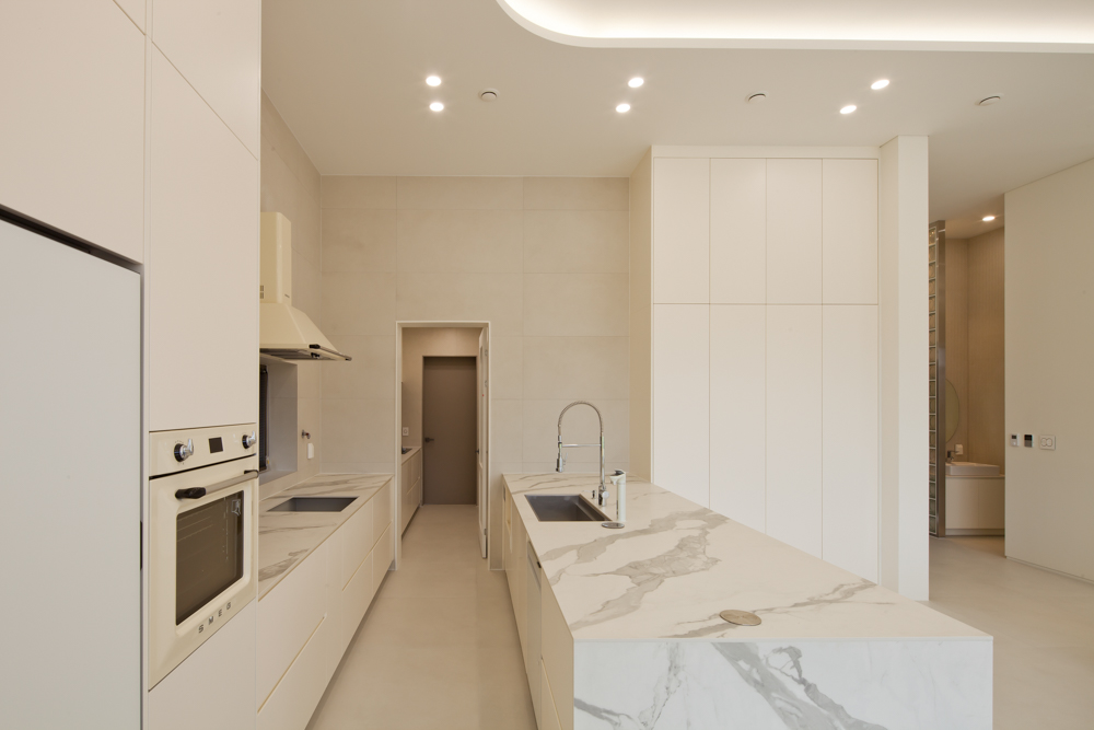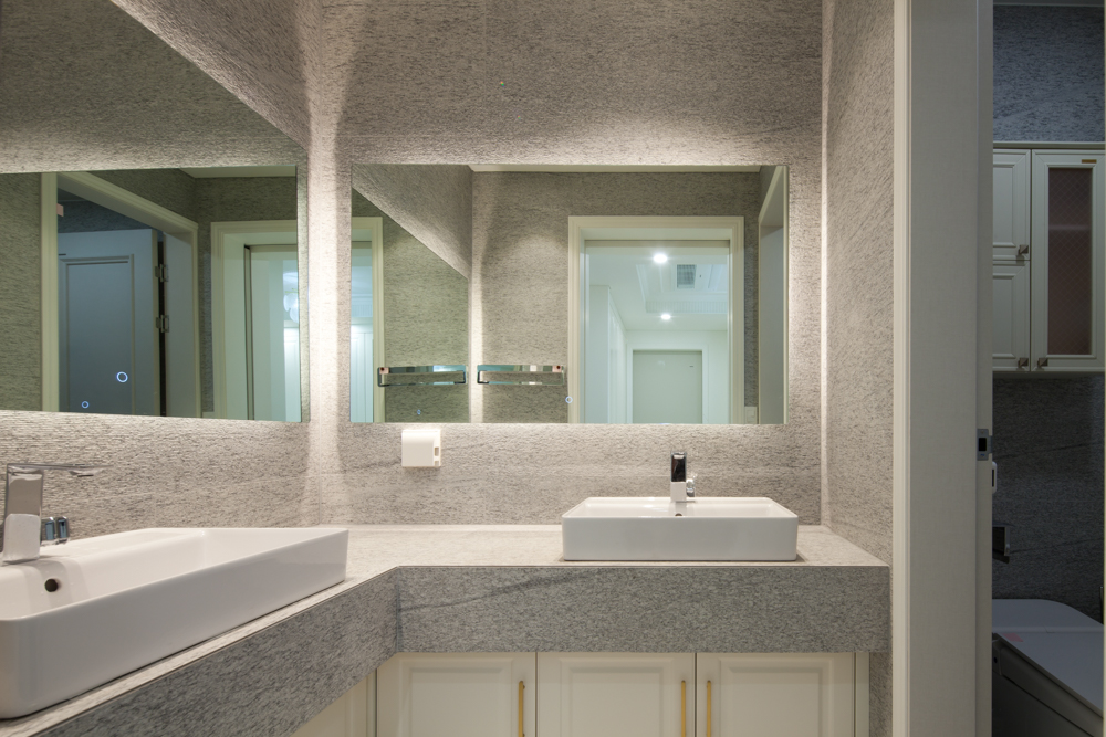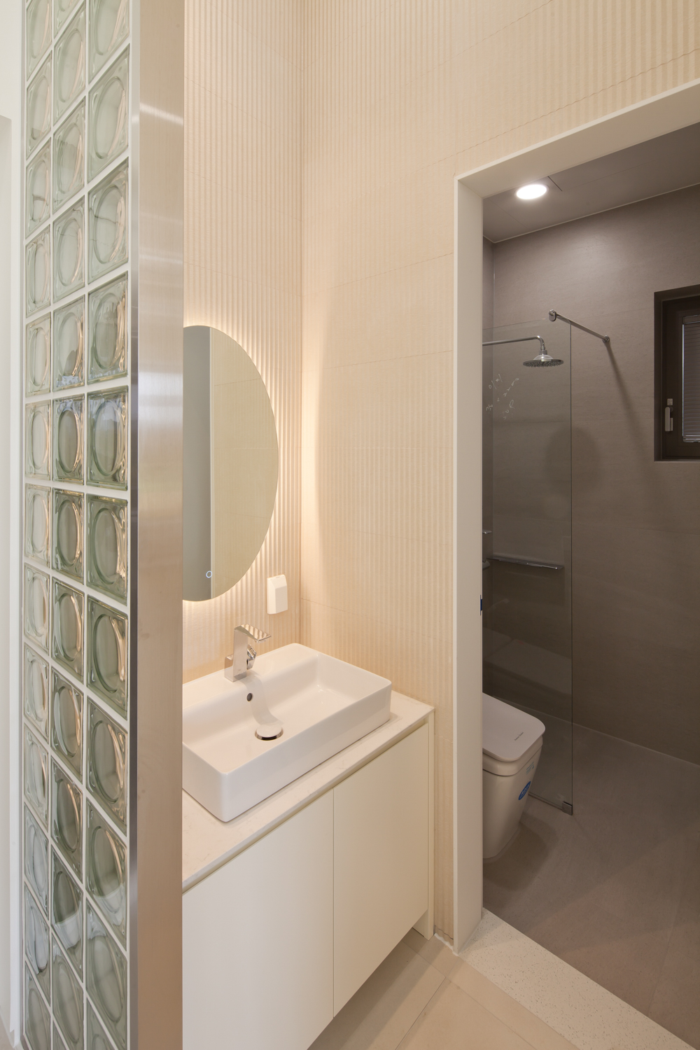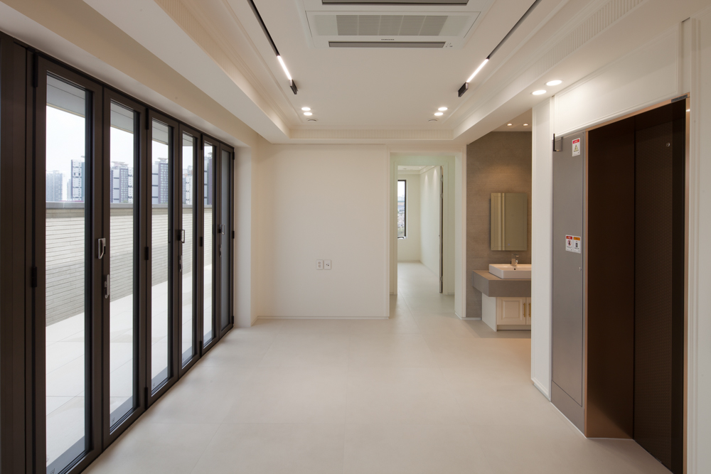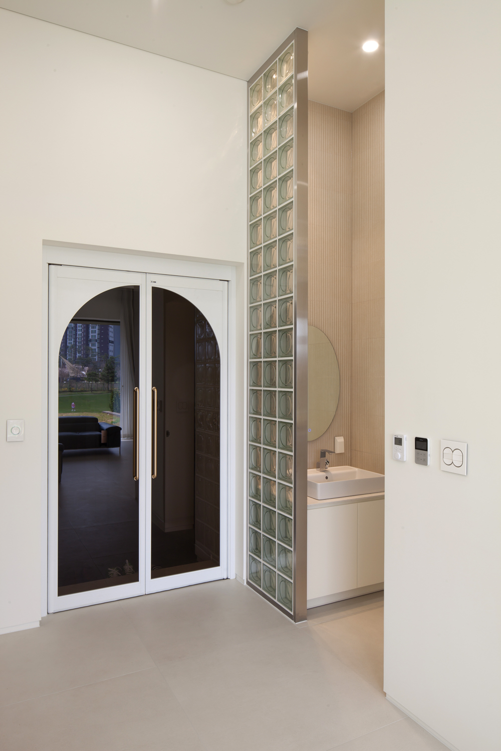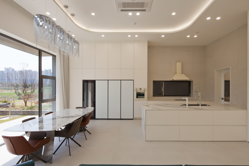 부부는 원래 거주 형태인 아파트와 차별화된 공간을 원했는데, 특히 가능한 한 넓고 단순한 공간을 바탕으로 화려한 인테리어 요소를 가득 채우려는 구체적인 계획이 있었다. 또한 대지의 가장 큰 이점인 골프장 전망을 최대한 누릴 수 있는 쾌적한 환경을 조성해달라는 요구도 있었다. 이를 바탕으로 더 라운지를 계획할 때 ‘장식 요소를 방해하지 않는 건축’, ‘높은 층고로 기존 아파트와 차별화된 공간 제공’이라는 두 가지 기준을 설정했다. 건축주는 외부 디자인으로 드러나는 화려함보다는 생활하며 계속 마주하는 실내 공간의 화려함을 추구했다. 이 집에서 건축의 역할은 분명했다. 단순하고 명확한 공간 구획으로 뼈대를 만들고, 장식적인 꾸밈과 충돌하지 않으며 인테리어와 조명이 더 돋보이게 뒷받침해줄 수 있는 바탕이 되어야 했다.