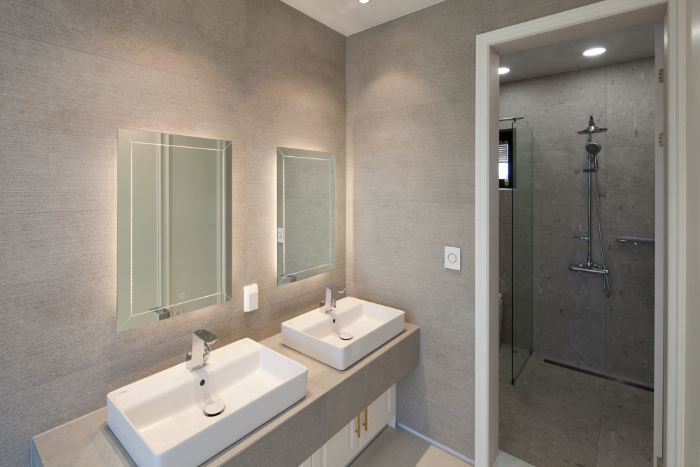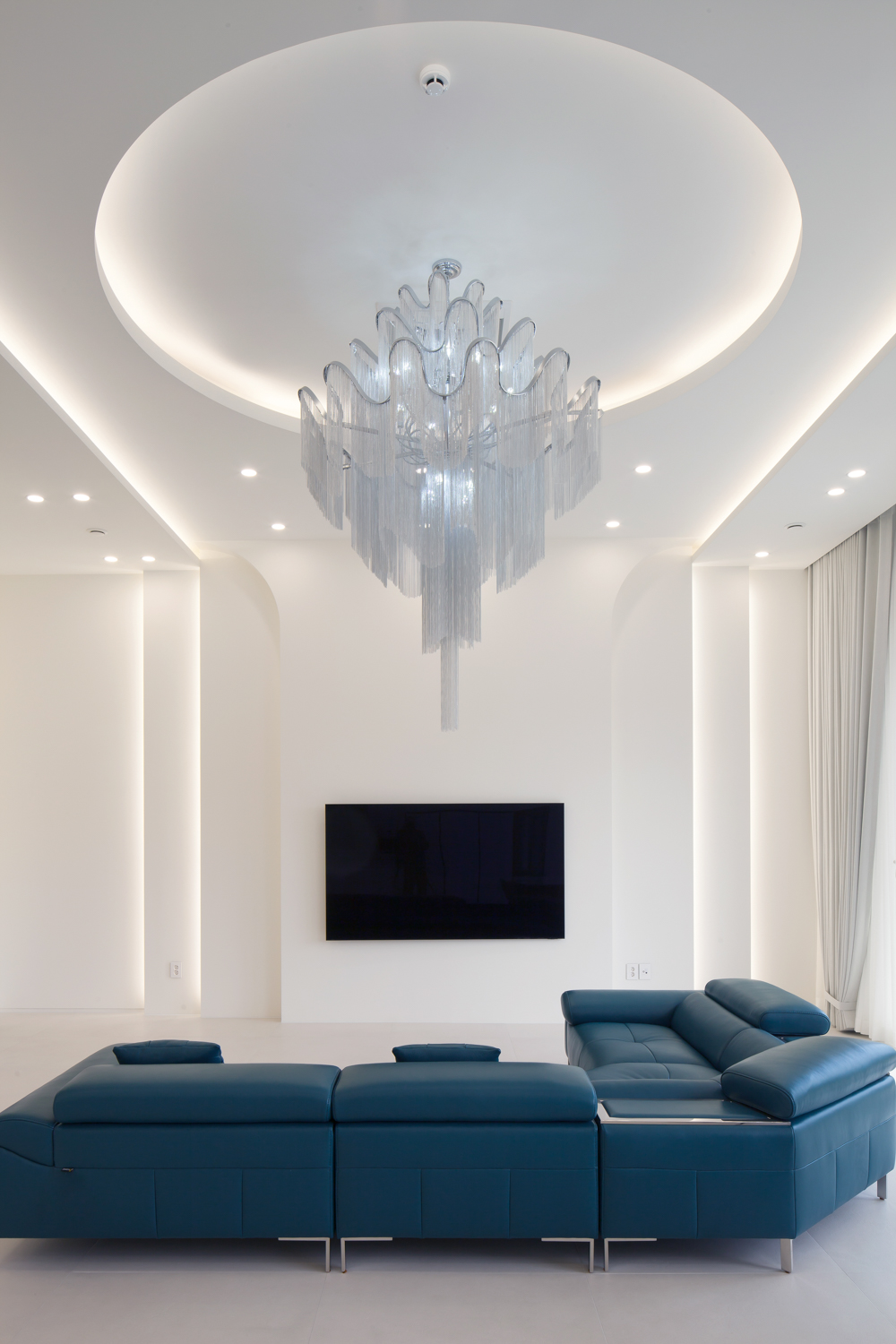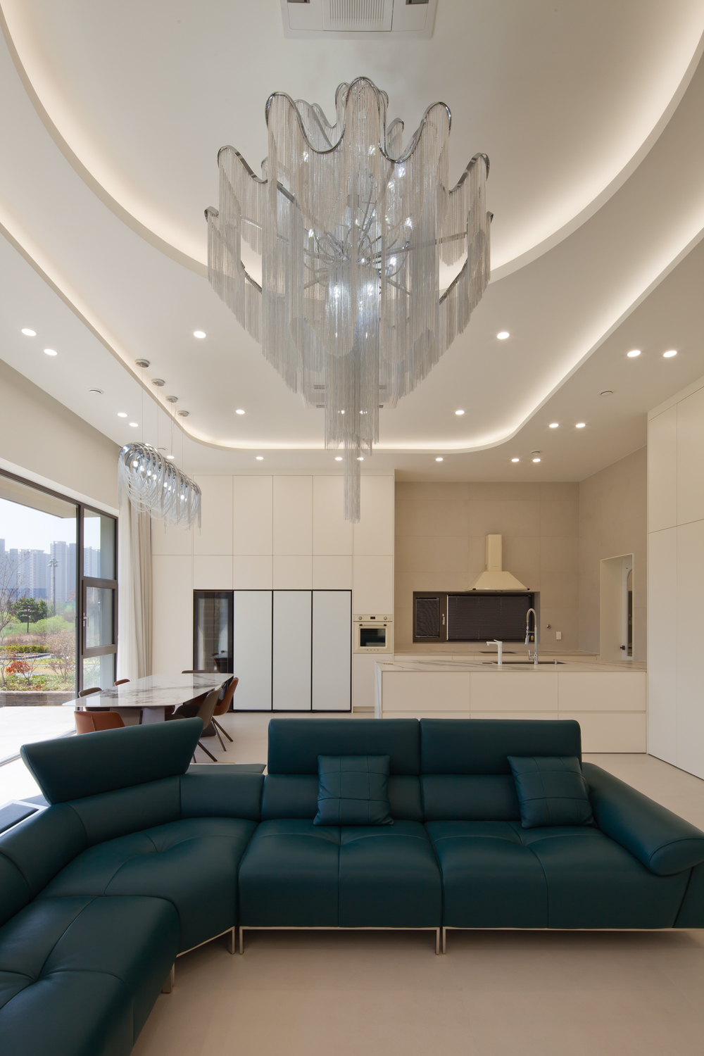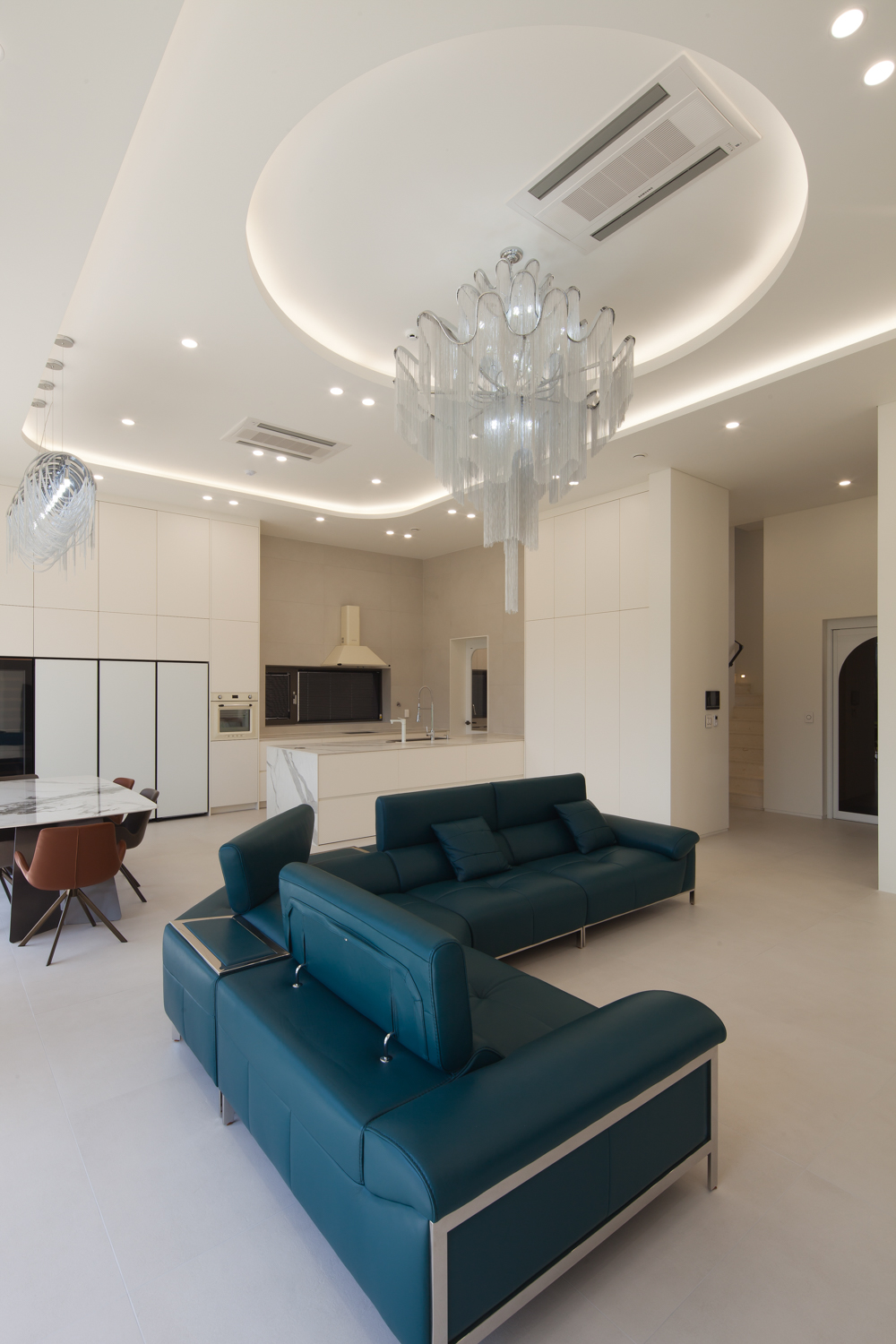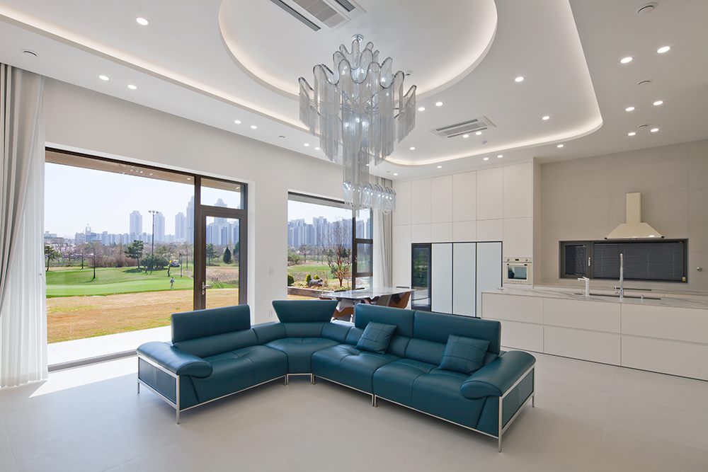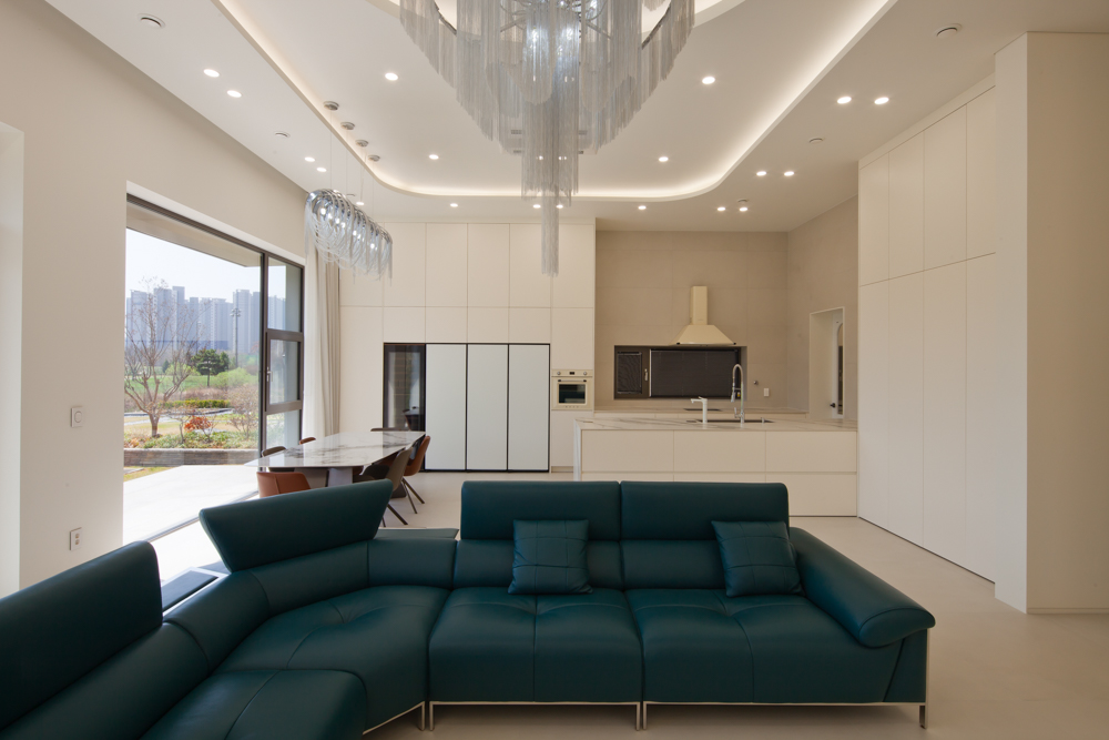 높은 층고에 맞춘 크고 화려한 샹들리에가 밝게 비추는 1층의 핵심 공간은 거실이다. 집을 방문하는 손님과 가족 구성원의 주요 활동을 수용하며 집의 분위기를 형성한다.
