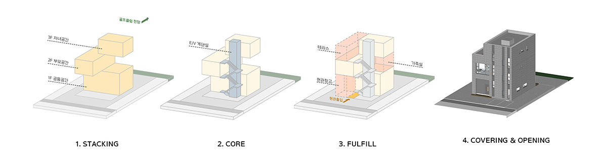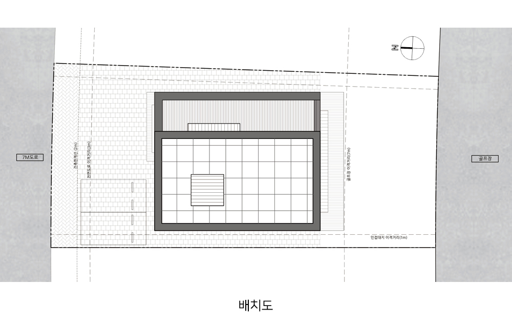 대지는 골프장 부지 내에 조성된 단독주택 필지로, 단지 전체가 인공 조성된 매립지다. 때문에 먼저 지반 조사와 구조 계산을 거쳐 PHC 말뚝을 계획했고, 3층 규모의 콘크리트 건물을 지지할 수 있는 기초 지내력을 확보하는 과정이 선행됐다. 북측으로 7m 도로를 접하고 남측에는 골프장 전망이 광활하게 펼쳐지는 대지를 보며 우리는 내부와 외부를 적극적으로 연계하는 방법을 고민했다.
