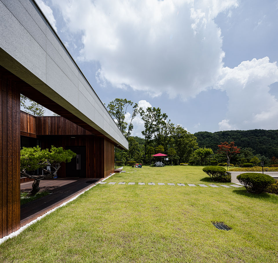 대지 내 지질 문제로 인해 최초 계획안에 비해 중정의 크기 및 건물 형태 도한 공사 도중 많이 수정되었지만, 현장 상태를 반영하여 최소한의 수정을 통해 기존 컨셉과 이미지를 살리기 위해 노력하였다. 외부 마감은 전면부와 후면부는 석재 마감을 진행한 후 목재 마감으로 포인트를 줬다.