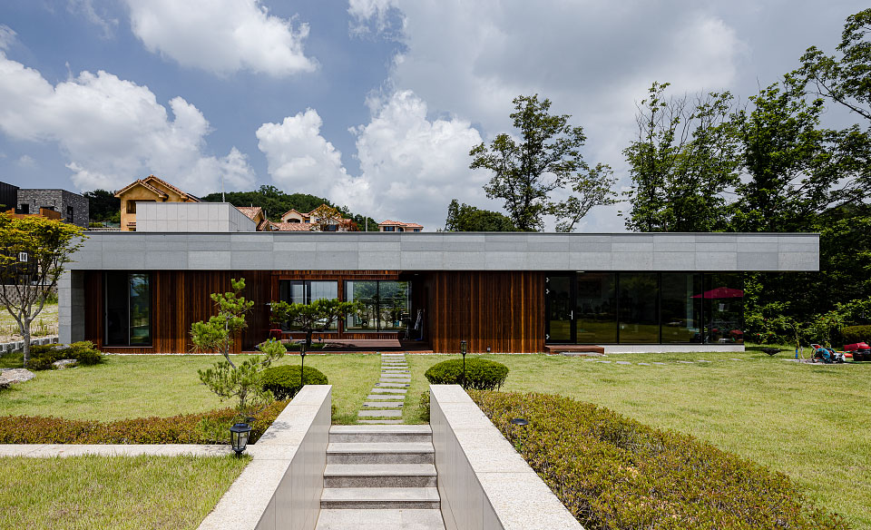 내부공간은 편의 및 거주성에 불편함이 생기지 않는 범위에서 공간을 나열하여 평면을 계획하고 대지의 형상에 순응하는 "ㄴ"자 평면으로 계획하였다. 주택은 정면의 정원과 건물 안의 중정 및 후정을 연결하는 공간이며, 정원 안의 오브제이다. 대지경계선까지 볼륨을 확장하고 1층 규모로 설계한 낮고 긴 형태의 집은 실제 크기보다 체감상 더 길어 보인다.